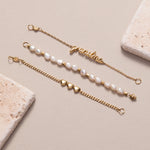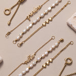 This charming bracelet includes three strands: a "grandma" nameplate strand, a pearl strand, and a fun dimensional heart strand, etched on the back with the phrase "Home is where the heart is."