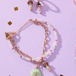 This double-strand bracelet features a charming Polly Pocket™ doll and the classic shell box. One strand is a sleek cable chain, while the other sparkles with pastel pearlized beads. The doll charm shines with colorful enamel, complemented by the pastel green shell box. Perfect for adding a fun, nostalgic touch to your look, this pre-layered bracelet pairs effortlessly with other Polly Pocket™ styles.