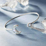 Moon and sun, yin and yang: the balance of nature is essential. The moon reflects the light of the sun, illuminating the night when life rests and restores itself. This bracelet features an open cuff design with a crescent moon on one end, and a sun on the other, both accented with reconstituted rainbow opal and sparkling glass crystal stone accents. Wear it and remember that when energies align, all things are possible.