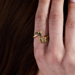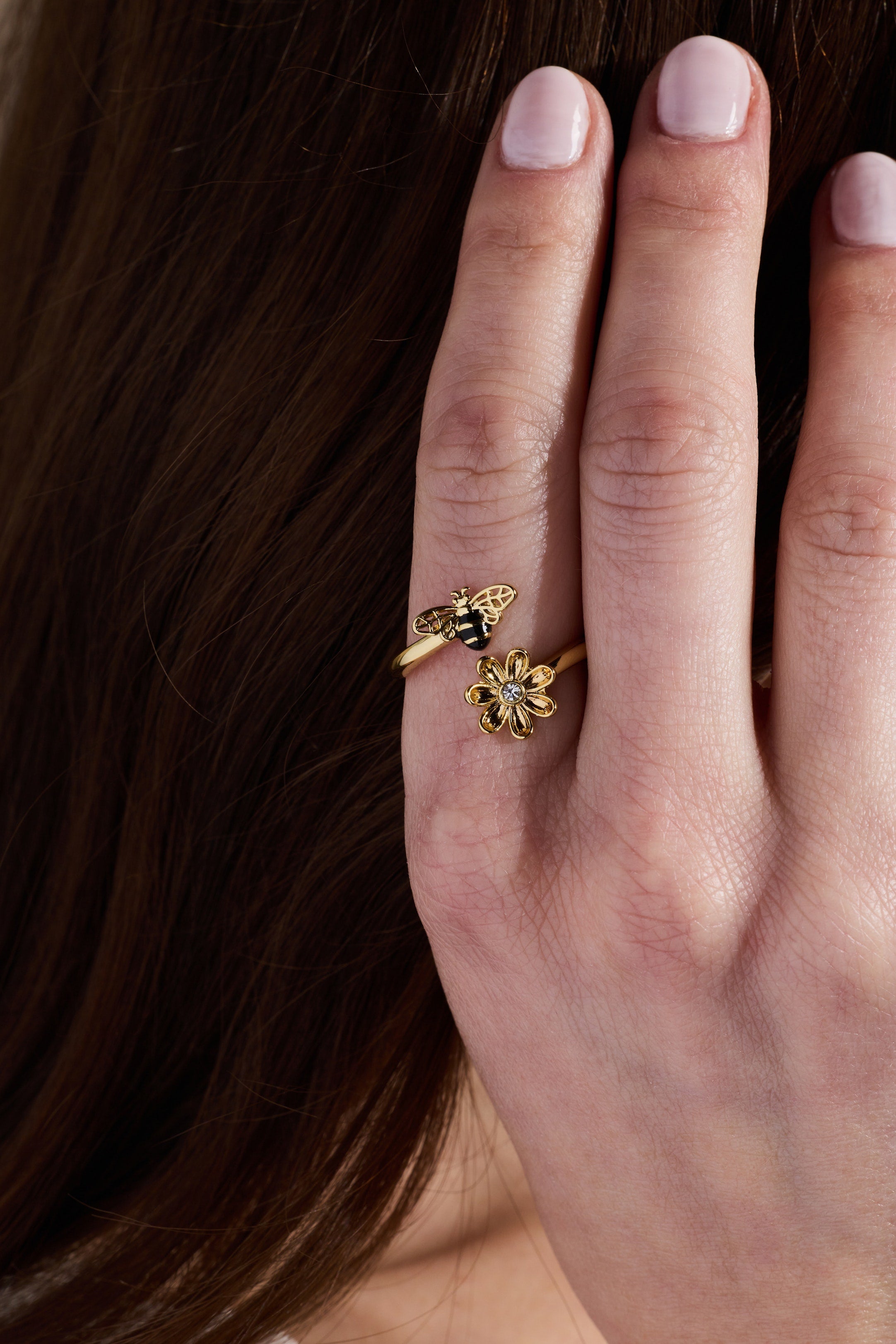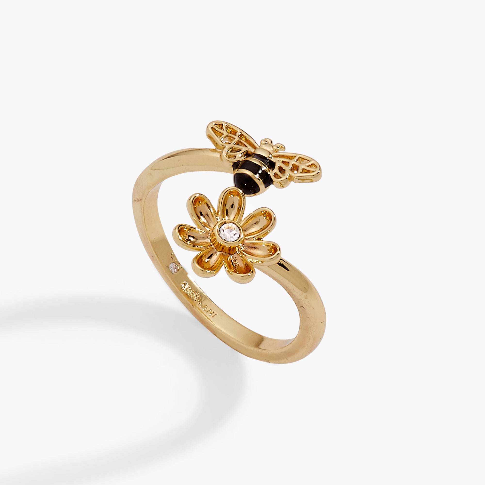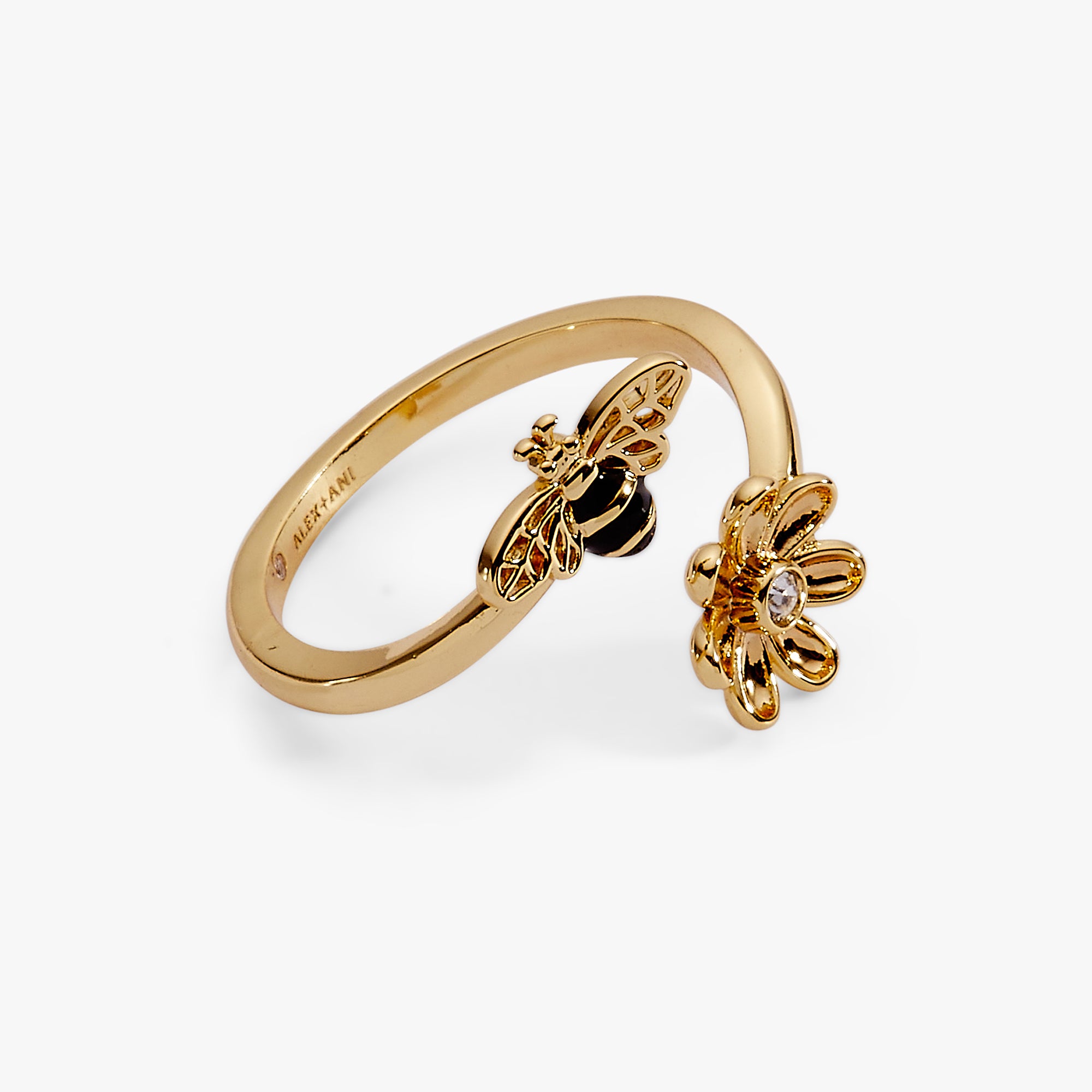 Celebrate the season with this delicate gold-plated wrap ring, featuring an intricate bee and daisy design that captures spring's natural beauty. A bezel-set clear crystal stone anchors the center, adding subtle sparkle to your everyday look. Perfect for layering or wearing solo, this fine jewelry piece brings timeless charm to your collection.