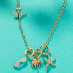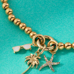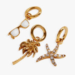 Bring a little getaway energy to your everyday stack with this tropical charm trio. Whether you're dreaming of sunshine or packing for your next trip, these mini-icons are your passport to instant summer vibes. This interchangeable charm set includes a dimensional palm tree, a pavé starfish with textured edges, and a pair of sunglasses with transparent resin lenses in a vibrant coral hue. Each charm is crafted in shiny gold-finished stainless steel and features a subtle etched logo with a CZ accent on the back. Add them to your favorite base to mix, match, and manifest your next beach day.
