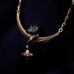 A sleek black cat, perched on a golden crescent moon, gently holds a shimmering star in its paws — a delicate charm set inline along a chain dotted with glossy black enamel beads. This graceful design flows seamlessly across the neckline, capturing the quiet magic and wonder of the night sky. Perfect for layering or wearing solo, it adds a subtle touch of celestial charm to any look.