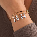 Celebrate your furry friend with this Pet Love Multi Charm Bangle. Featuring a striking two-tone design with a gold-plated base and silver puffy letter beads spelling out L, V, E, it adds a clever twist by replacing the "o" with an adorable puffy paw charm. Perfect for any pet lover, this playful accessory combines style and sentiment to keep your love for pets close at hand every day. Its lightweight, comfortable fit makes it ideal for stacking or wearing solo, bringing a joyful touch to any outfit.