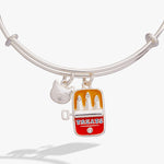 Add a splash of whimsy to your wardrobe with this charming bangle, featuring two delightful charms. The three-dimensional cat face adds a mischievous personality, while the detailed sardine tin engraved with "treats" brings a playful nod to feline favorites. Charms are adorned with sparkling crystals and vivid enamel accents, catching the light with every movement. Perfect for cat lovers who appreciate a fun, unique accessory that sparks conversation and adds a joyful charm to any outfit.