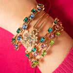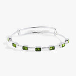 Whether you're commemorating an August birthday or you're drawn to the protection and wealth of the peridot-colored crystal, the Emerald-Cut Birthstone Bangle will add personalized elegance to your stack. This birthstone bangle features seven emerald-cut green crystals on an expandable wire bangle in a shiny gold or silver finish.