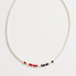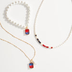 - Adorned with glass Pearls, Red Jade, and Blue Sandstone