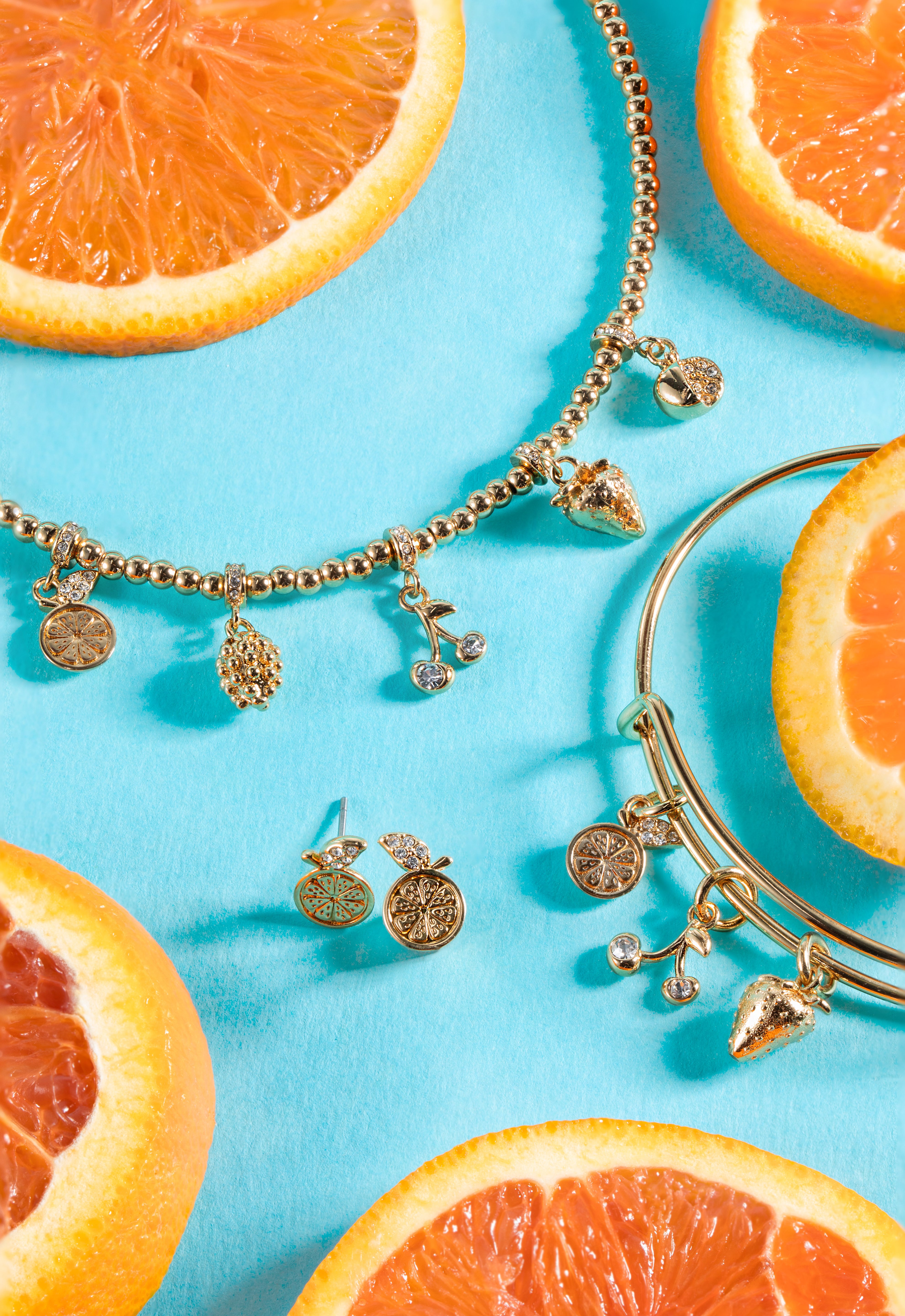 Add a touch of autumn sweetness to your jewelry collection with the Fall Harvest Charm Bangle. This adjustable wire bangle showcases three vibrant charms—a crystal-studded orange slice, shimmering cherries, and a bright strawberry—all set in polished gold-finished brass. Perfect for layering or wearing solo, its flexible sizing from 2" to 3.5" ensures a comfortable, effortless fit that celebrates the season’s harvest vibes.