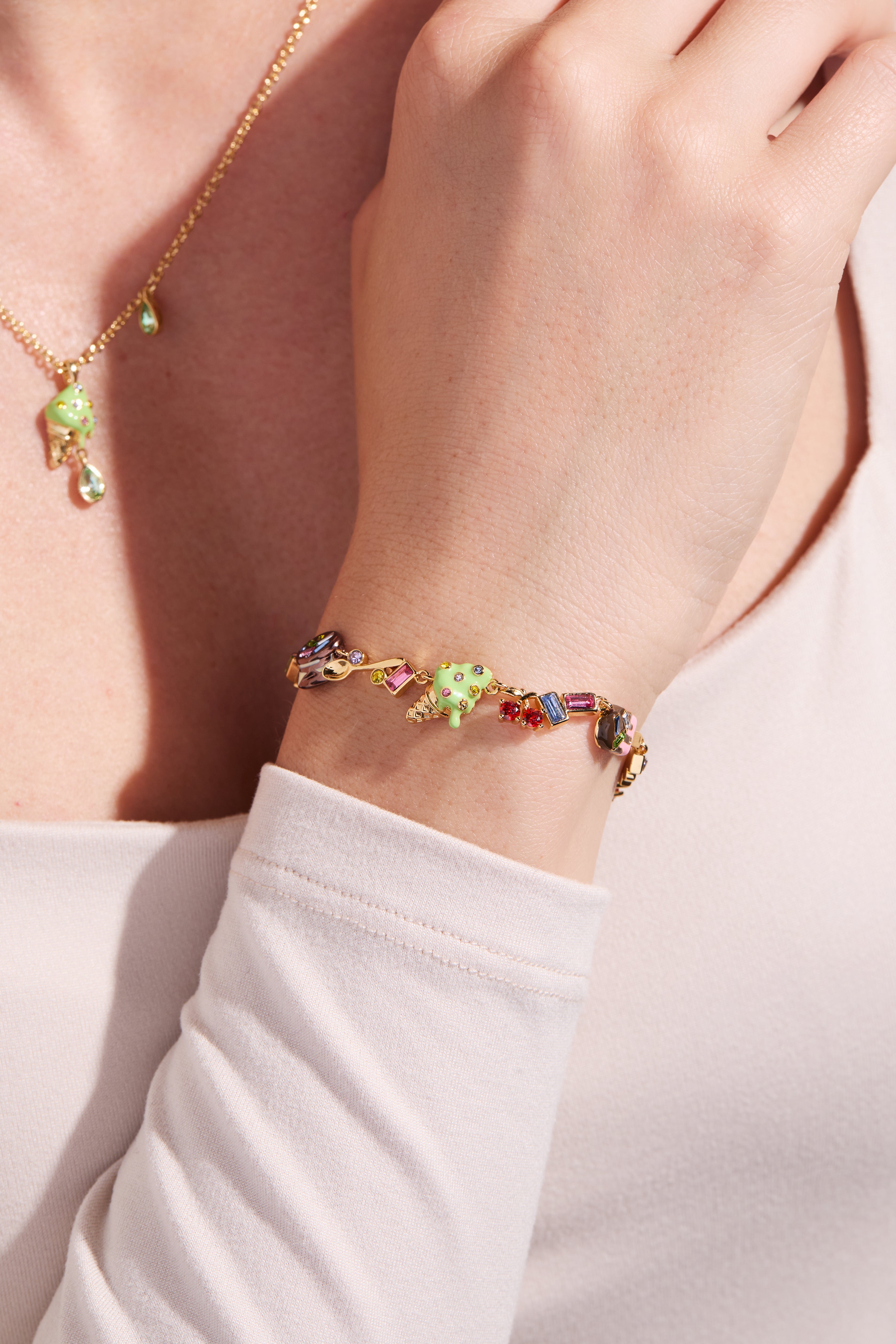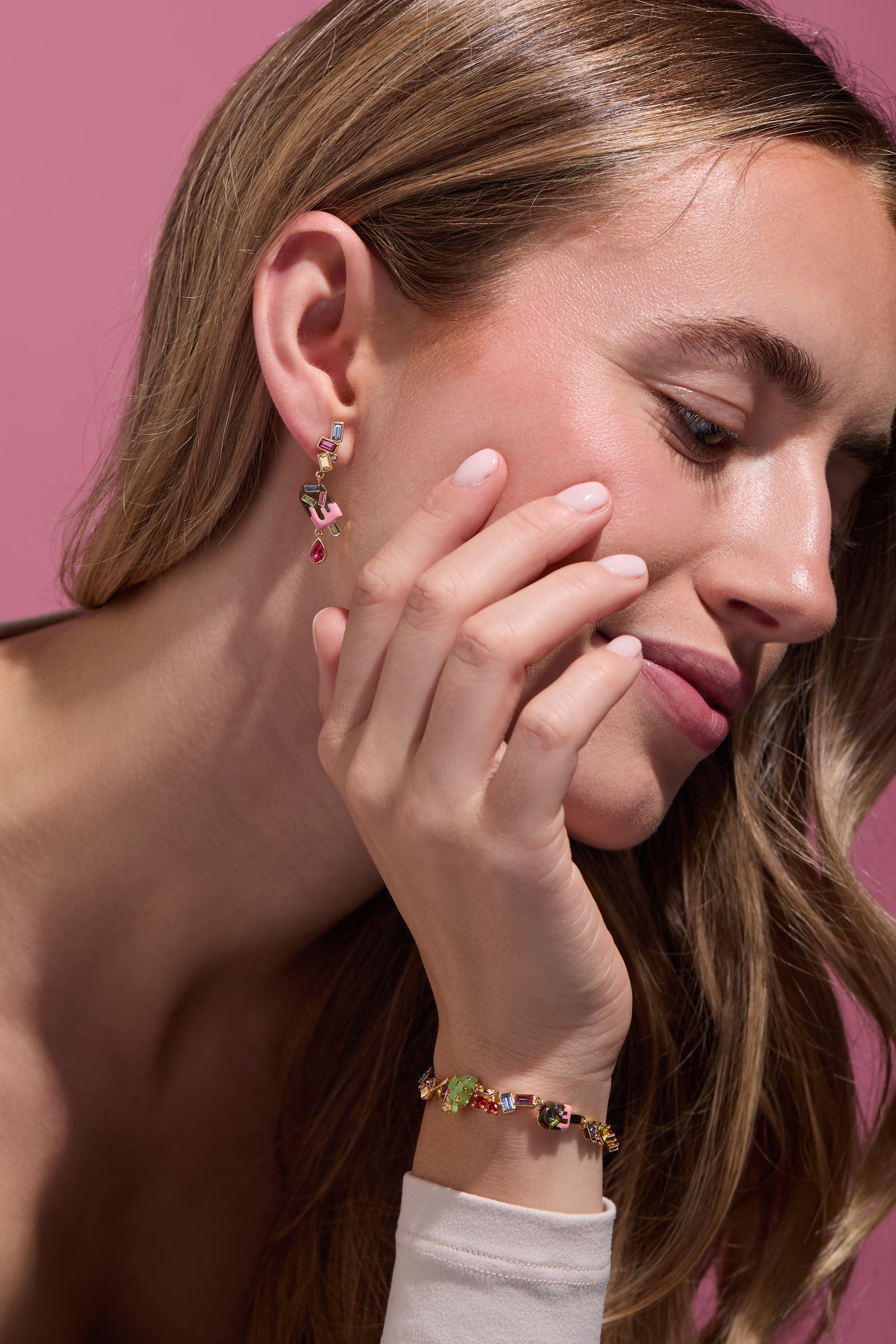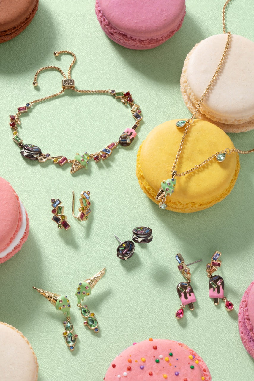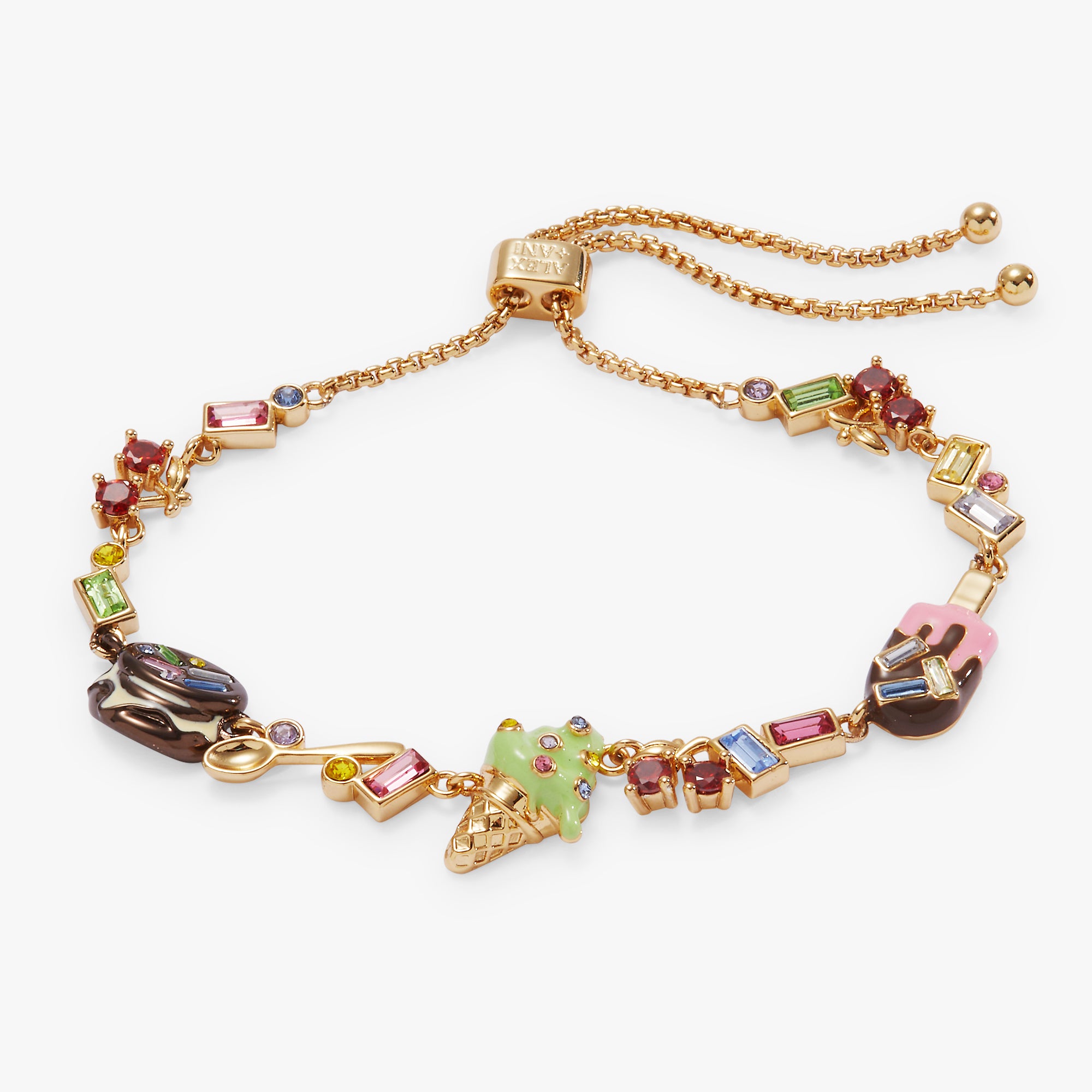 A sweet celebration of summer’s best treat, this whimsical bolo bracelet is packed with playful personality and candy-colored charm. Featuring dimensional enamel stations shaped like an ice cream cone, popsicle, sandwich, and a sprinkle of sparkle, this adjustable style is finished with a cherry on top—literally. Crafted in shiny gold-plated brass with multicolored crystal accents and a sliding clasp for the perfect fit, it’s the ultimate way to wear your dessert and stack it too.
