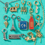 Channel the magic of mountain mornings and campfire nights with this cozy charm trio—designed for the outdoor daydreamer. This interchangeable charm set features a gold camper van detailed with black and enamel accents, a layered pine tree cluster, and a glowing campfire with textured wood logs and an open flame silhouette. Each charm includes a back-set cubic zirconia and is crafted in shiny stainless steel with warm gold tone plating. Perfect for mixing into your charm bar or adding to your favorite base—this set brings a little wilderness wherever you wander.