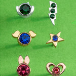 Who says your earrings have to match? This Powerpuff Girls(tm) mismatched stud set brings all three super sisters together with pink hearts, blue sapphires, green shamrocks, glittering lightning bolts, and starry crystals. Each stud is crafted with tri-tone plating and bezel-set crystals for a playful, collectible vibe that lets you create your own ear party. Wear them solo, stack them up, or mix them with your other Powerpuff favorites for a look that’s uniquely yours.