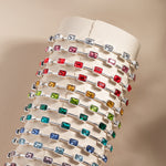 Whether you're commemorating a July birthday or you're drawn to the passion and strength of the ruby-colored crystal, the Emerald-Cut Birthstone Bangle will add personalized elegance to your stack. This birthstone bangle features seven emerald-cut red crystals on an expandable wire bangle in a shiny gold or silver finish.