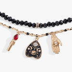 Step into the mystical with this double-strand Halloween Divination Charm Bracelet. One strand features a gold chain adorned with jet-black stones and eerie charms—an Ouija planchette, a red crystal-topped candle, and a crystal eye-detailed hand. The second strand, a black and silver chain, adds a shadowy touch, perfect for conjuring up some spooky style. Wear it if you dare!