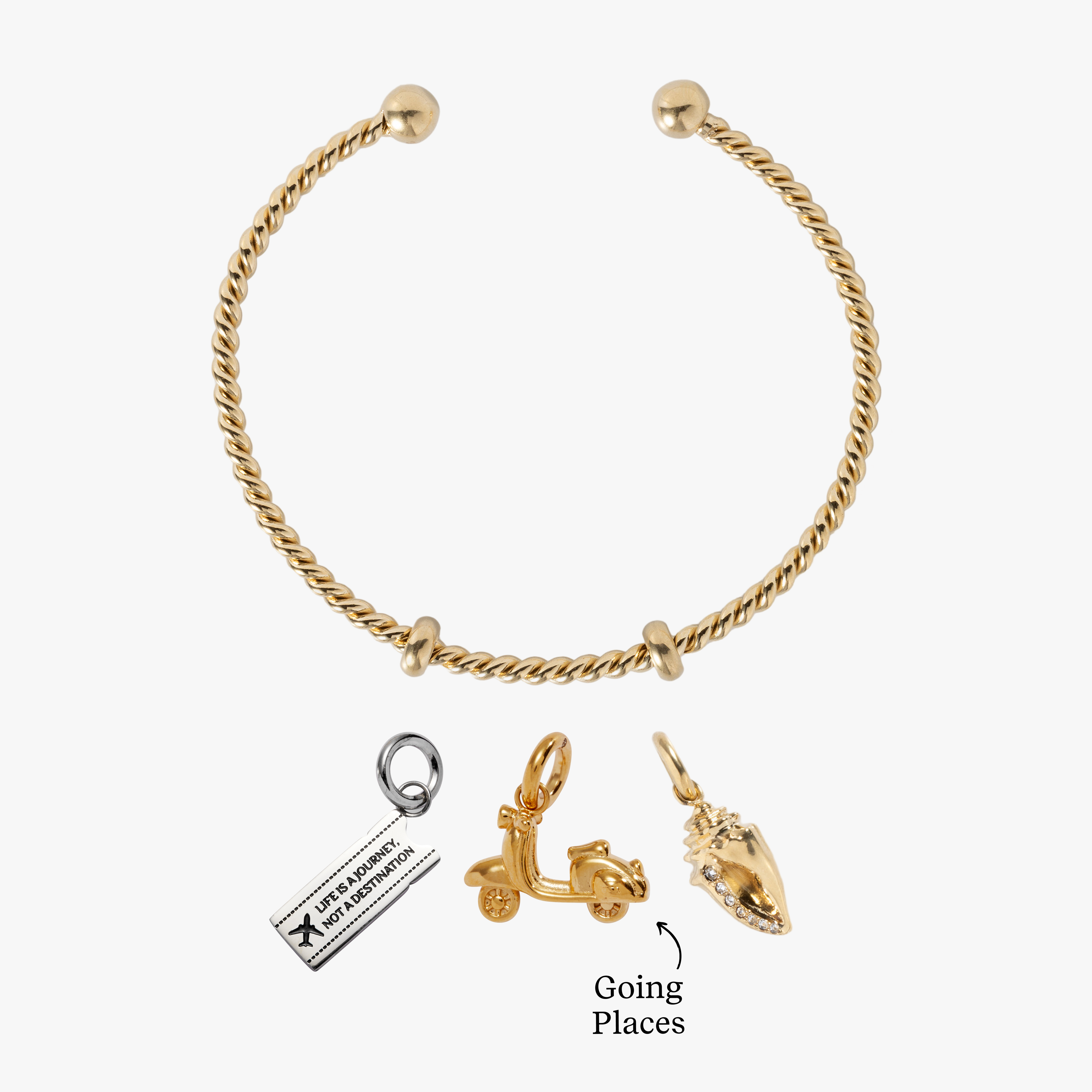 This bundle is for the one who’s always booked and busy—complete with a Vespa, conch shell, and travel ticket charm. Includes a free French Rope Cuff bracelet base to start your story.