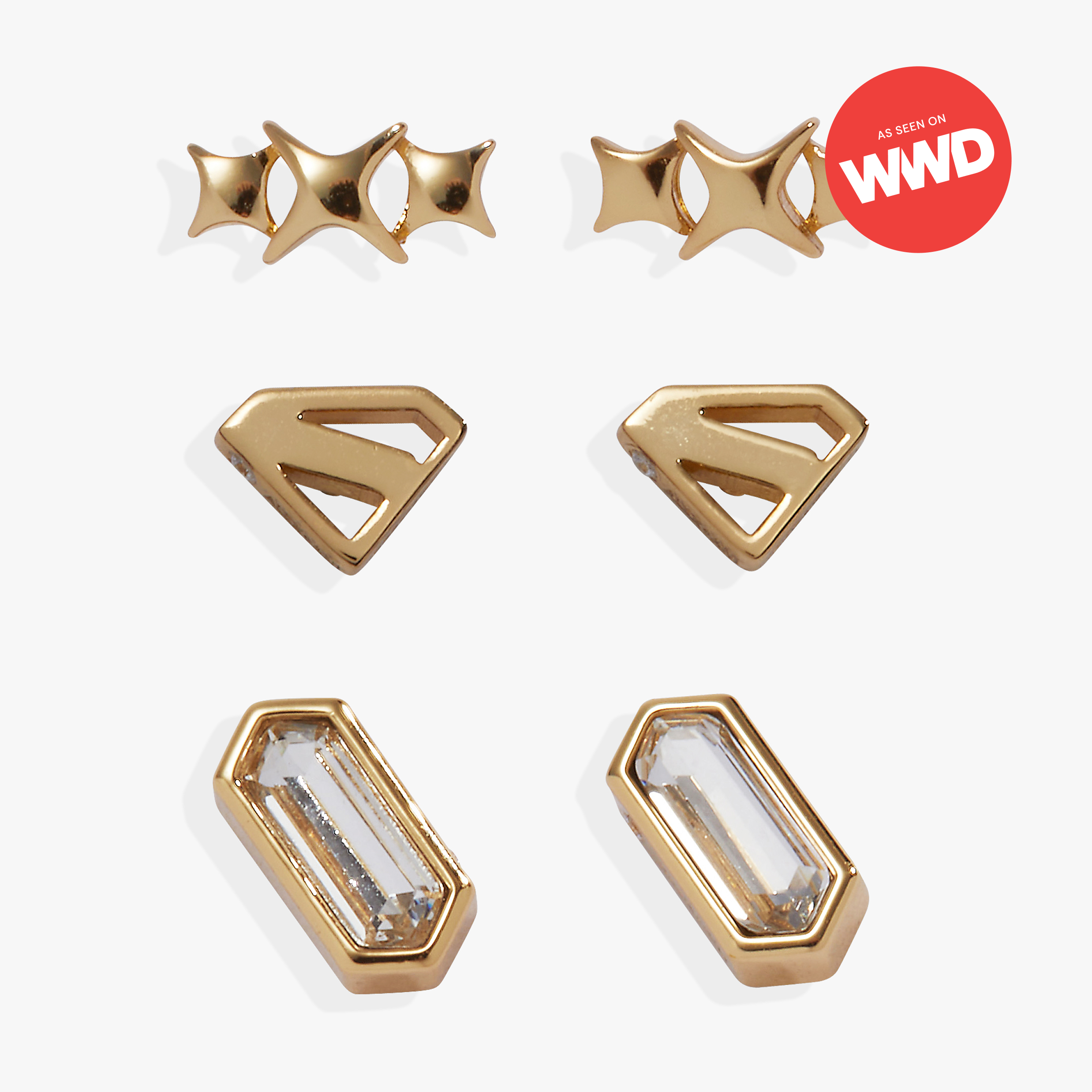 Inspired by Superman’s story from Krypton to Earth, this 3-piece earring set brings subtle fandom into your everyday stack. The gold-plated set includes a dimensional star cluster representing his Kryptonian origins, openwork Superman™ logo studs, and faceted clear crystal hexagon studs symbolizing the Fortress of Solitude. The mix of iconic shapes and fine jewelry details allows you to create endless ear party combinations, whether you're stacking multiple piercings or swapping them out to match your mood. A perfectly elevated gift for Superman™ fans — or a personal style statement that keeps your love for the hero close. Superman™ x Alex and Ani collab.
