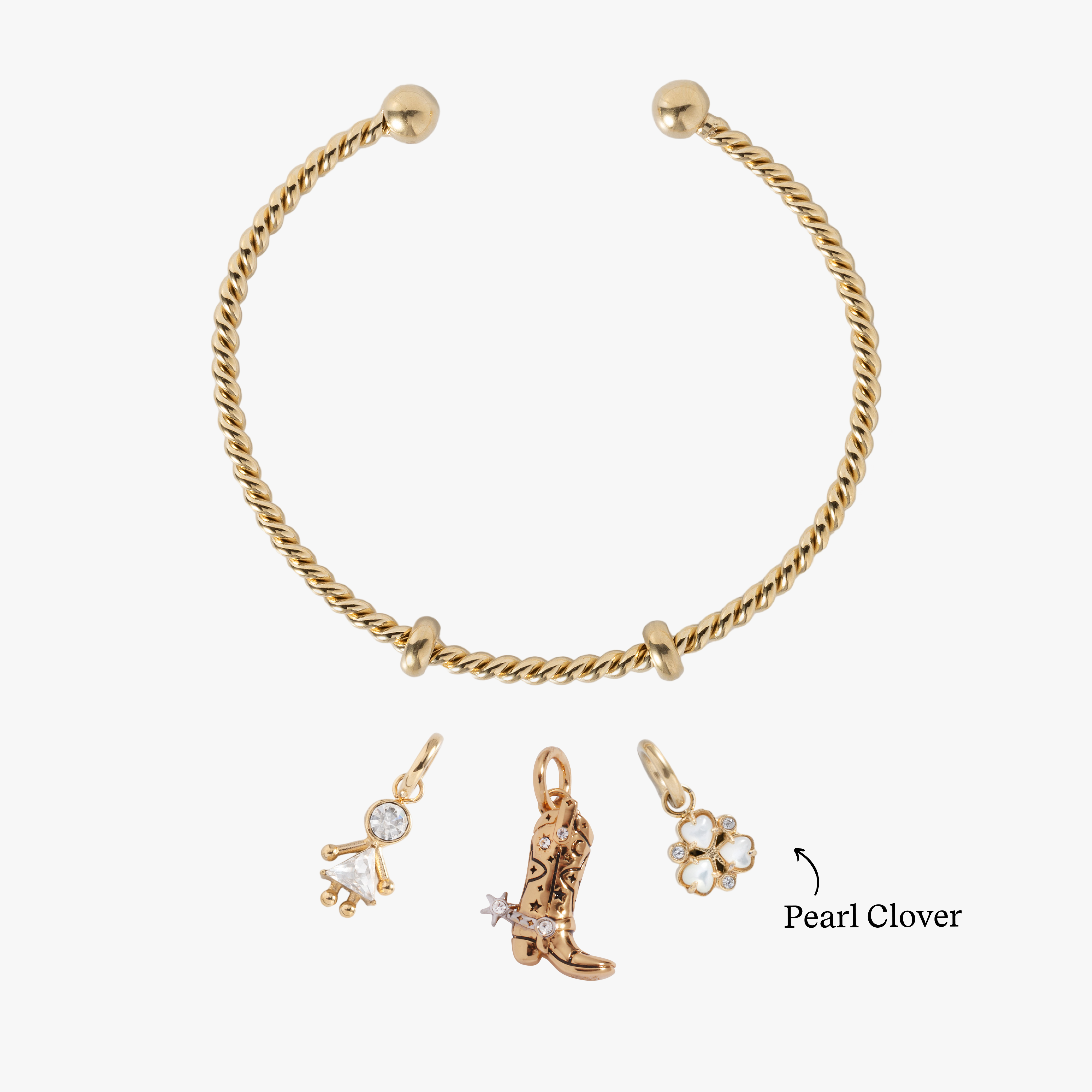 Ride into a world of charm with the Cowgirl Dreamin' Charm Bundle! This playful set features a Cowgirl Boot Charm alongside sparkling Crystal Girl and Pearl Clover Interchangeable Charms. Complete your look with a free French Rope Charm Bracelet Cuff—perfect for mixing and matching your style with a touch of western flair and feminine sparkle. Get ready to dream big and accessorize boldly!