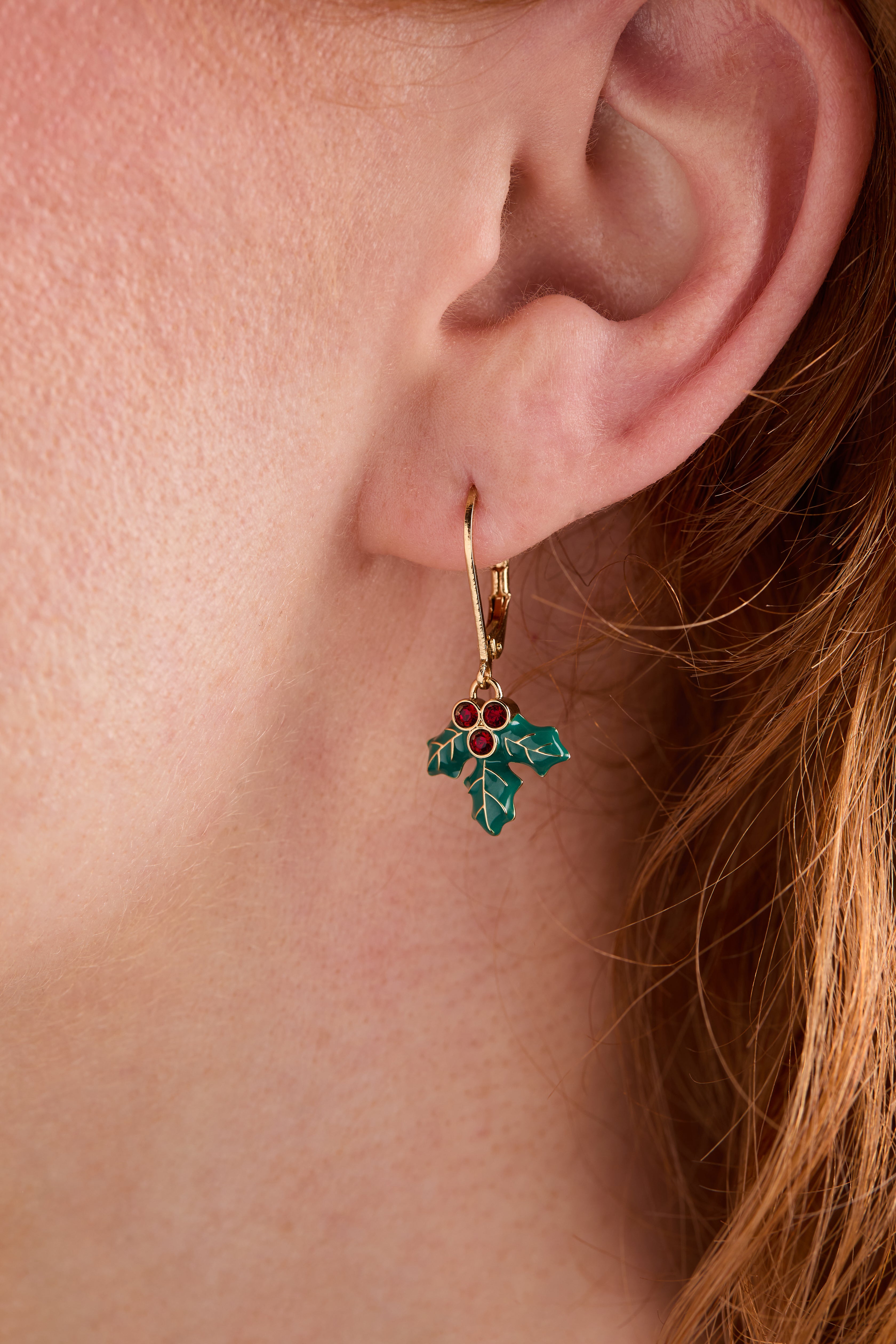 These lever back earrings hold charming green enameled holly drops, accented with sparkling Siam crystal berries for a festive touch. Perfect for adding a bit of holiday cheer to any outfit, these earrings bring a playful sparkle that's ideal for seasonal celebrations or everyday wear. Lightweight and eye-catching, they’re designed to brighten your look with a dash of festive fun.