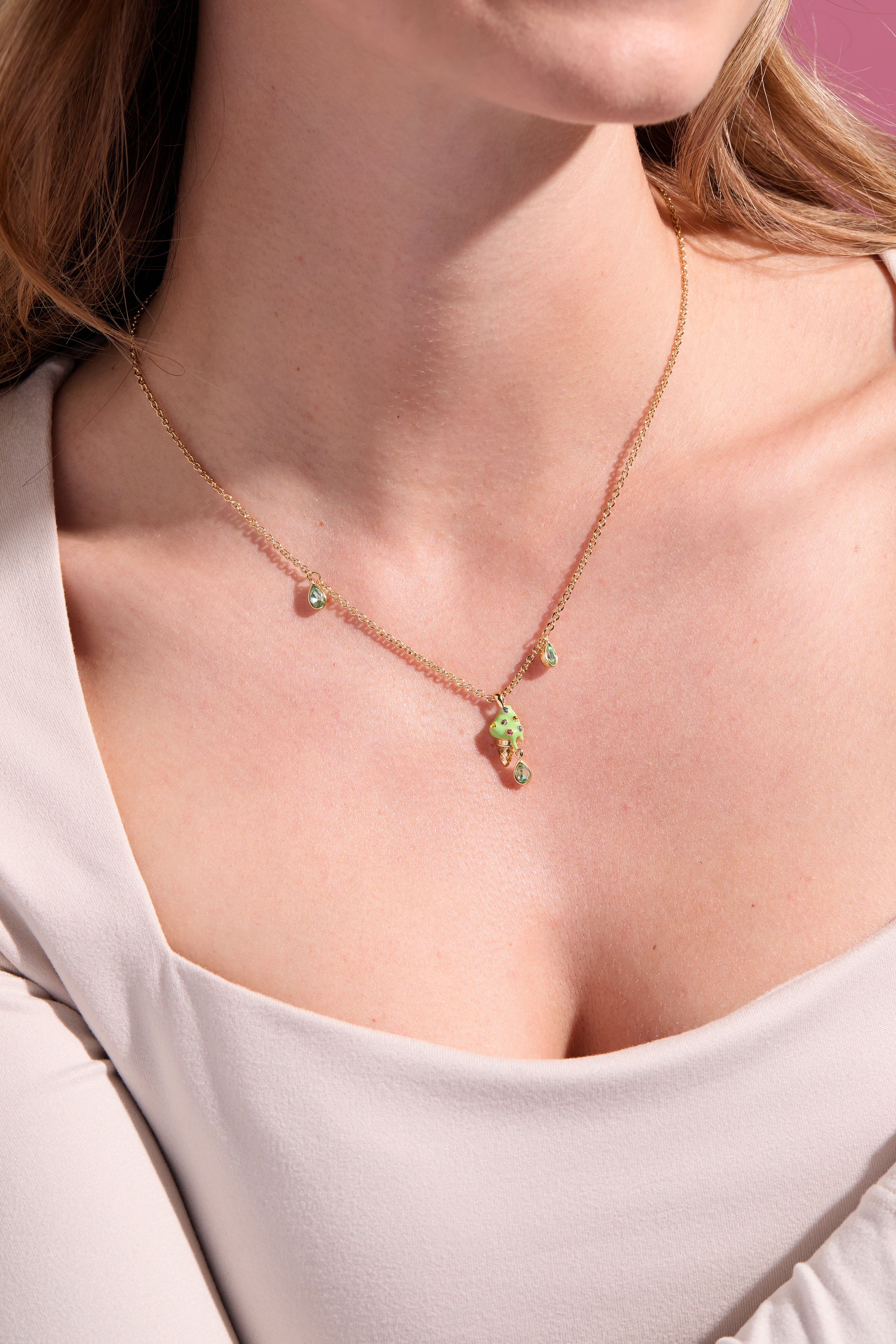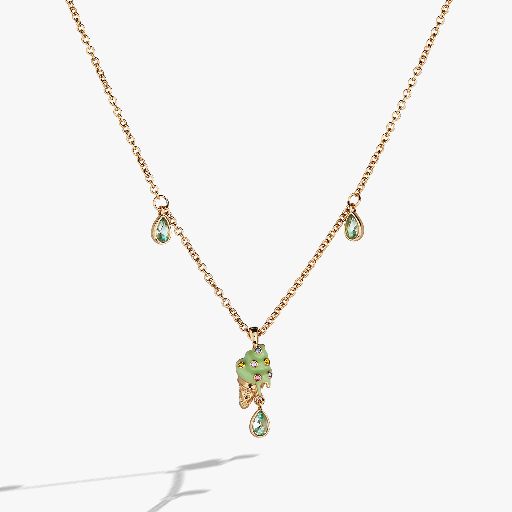 A scoop (or three) of joy, this Ice Cream Cone Necklace brings the sweetness in style. Set on a dainty gold-tone cable chain, the dimensional cone features drips of pistachio green enamel and a colorful mix of multi-cut stones—like sprinkles!—in vibrant pinks, blues, and greens. A drop charm dangles below for a little extra sparkle and swing. Wear it solo or layer it up to top off your look with a wink of whimsy.