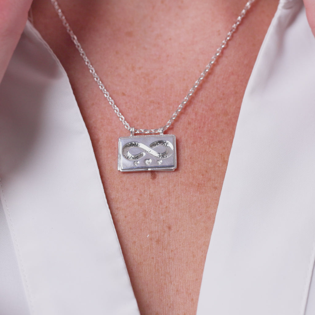 Meditate on your affirmations daily to soak them into your very essence. This silver affirmation charm necklace features a hidden message charm inscribed with “The love of a family is life’s greatest blessing.” Flip the cut-out, crystal-embellished infinity charm to reveal the entire affirmation. With elevated detailing, this adjustable charm necklace can be layered for everyday wear or stand alone on your night out look.