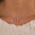This festive necklace features an enamel beaded chain adorned with a charming candy cane pendant decorated in bright red enamel stripes and sparkling clear crystal pave accents that catch the light beautifully. Adding to its festive appeal is a delightful wrapped candy charm, detailed with bezel-set clear crystals that shimmer with every movement. Perfect for celebrating the holiday season or adding a touch of sweetness to any outfit, this pendant brings fun and sparkle to your jewelry collection.