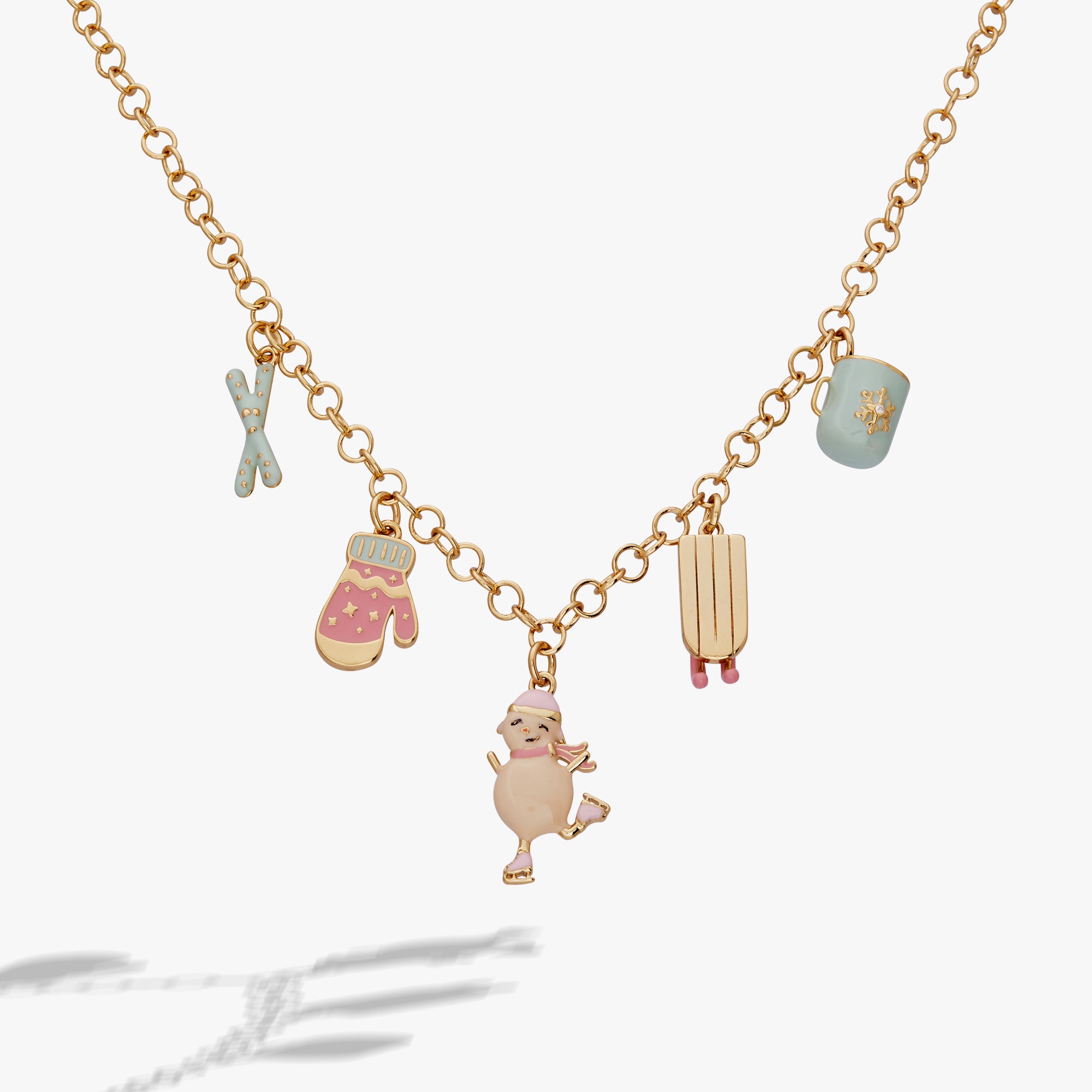 Embrace the magic of winter with this delightful charm necklace that celebrates all your favorite cold-weather moments. This piece features an enchanting collection of enamel charms including skis ready for the slopes, a cozy mitten, an adorable ice-skating snowgirl complete with hat and scarf, a speedy sled, and a steaming hot cocoa mug adorned with a snowflake. Each charm is thoughtfully designed to capture the joy and nostalgia of snowy days and winter adventures. The necklace is finished with a signature logo star accent that adds the perfect touch of sparkle. Whether you're a winter enthusiast or looking for a gift that spreads seasonal cheer, this charming necklace brings warmth and whimsy to any outfit year-round.