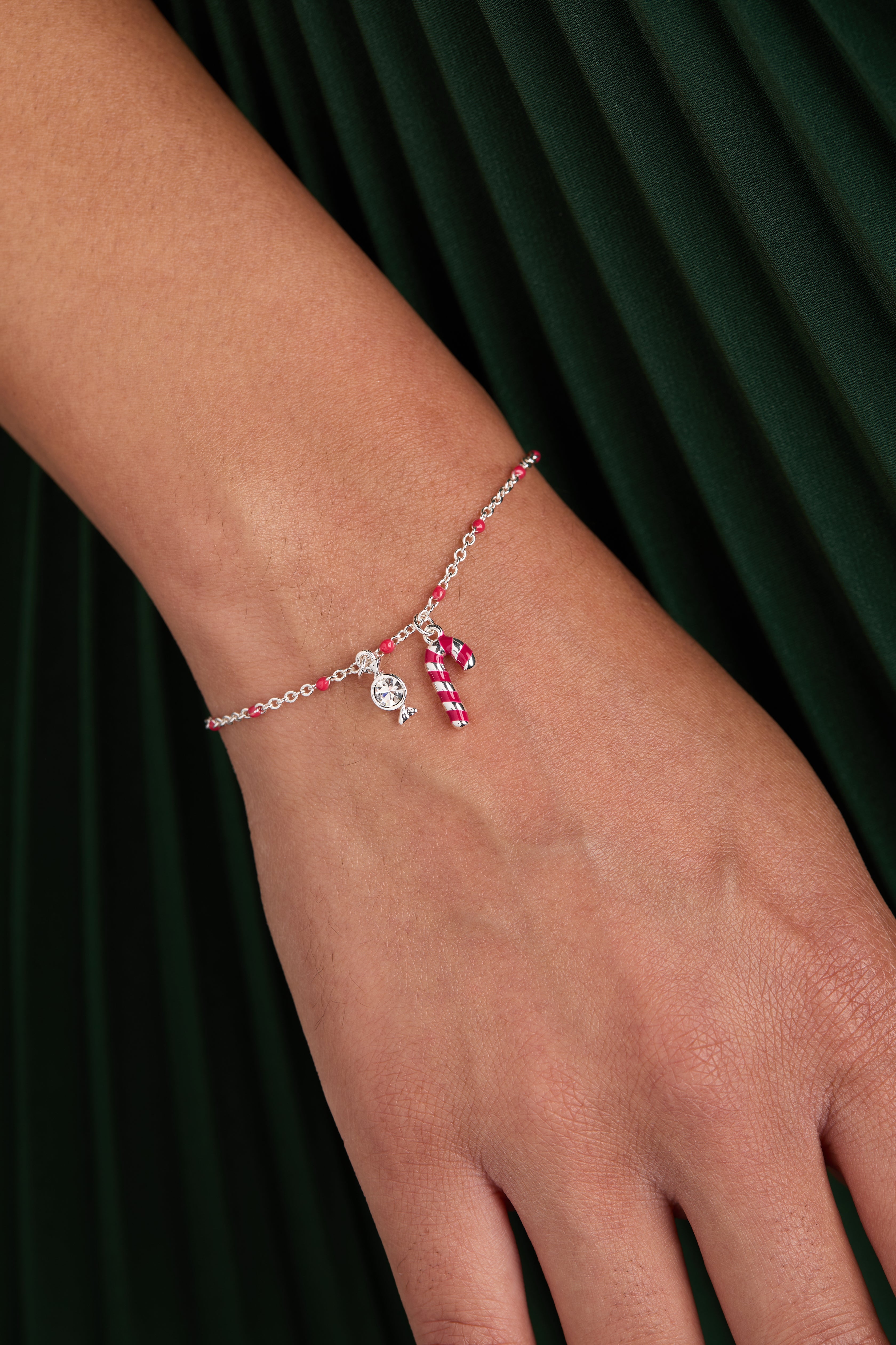 Embrace the holiday spirit with this cheerful Candy Cane Bracelet. Featuring a silver-plated chain with vibrant red enamel, it’s adorned with a red enameled candy cane and a sparkling wrapped candy charm accented by a bezel-set clear crystal. A fun and festive accessory, it adds a sweet touch of seasonal joy to any look.