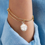 Grow at your own pace, in your own style. This gold-tone charm bangle features a silver and gold circular charm engraved with "Bloom Your Own Way," framed by intricate three-dimensional flowers in mixed metal tones. A wearable reminder that every journey unfolds beautifully in its own time.