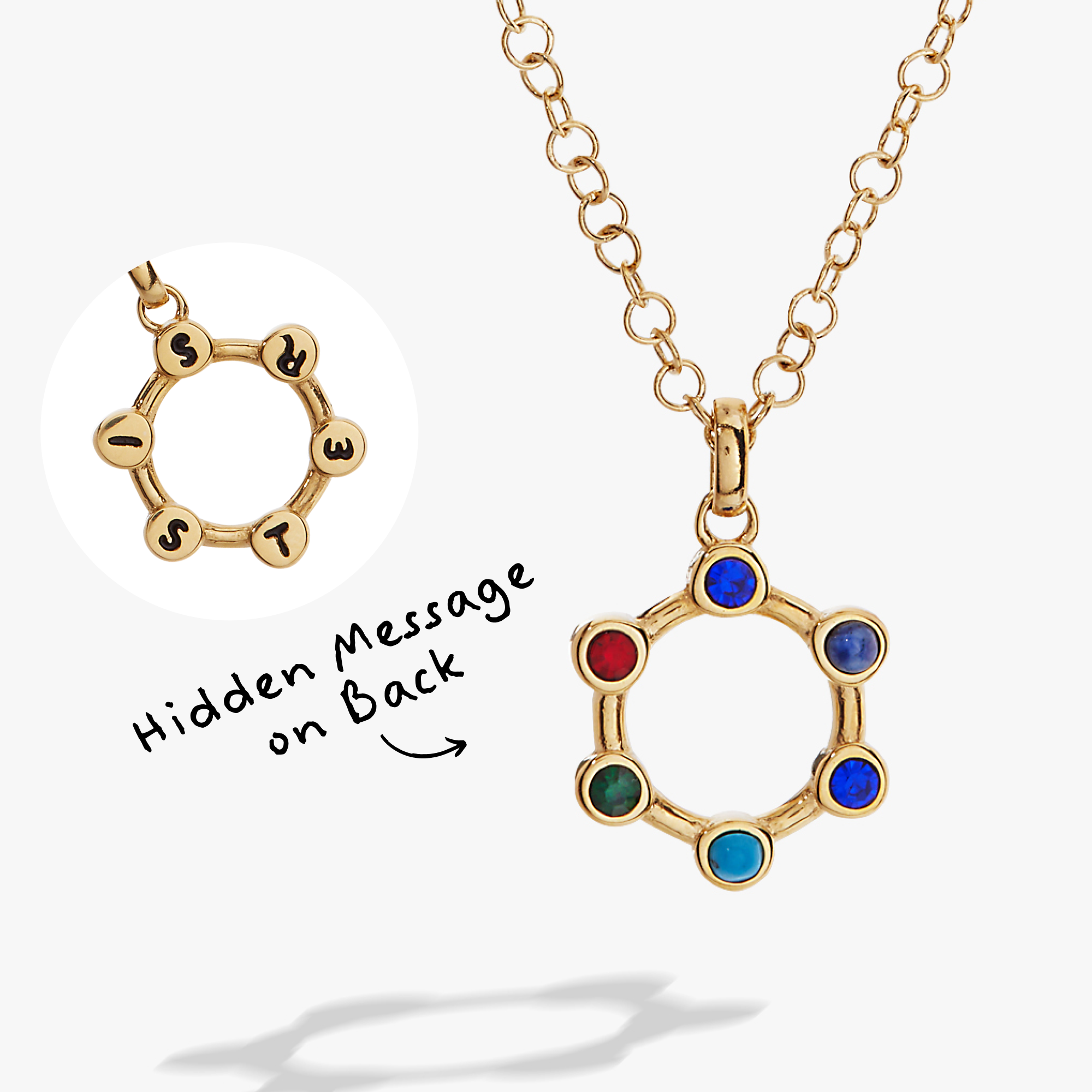 She knows you love her, but spell it out with this Sister Crystal Necklace, which holds a secret: on the interchangeable charm, each letter stands for a different colored crystal. S is for sapphire, I is for iolite, S is for sapphire, T is for turquoise, E is for emerald and R is for ruby. It's a secret message just for her, from your heart.
