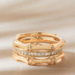 A symbol of strength and flexibility, bamboo is the ultimate accessory. This 3-1 ring set features two golden bamboo motif rings with a pave crystal-covered ring in the center. Designed for versatility, these rings can be worn together or styled separately. Perfect for stacking, layering, or keeping it minimalist!