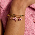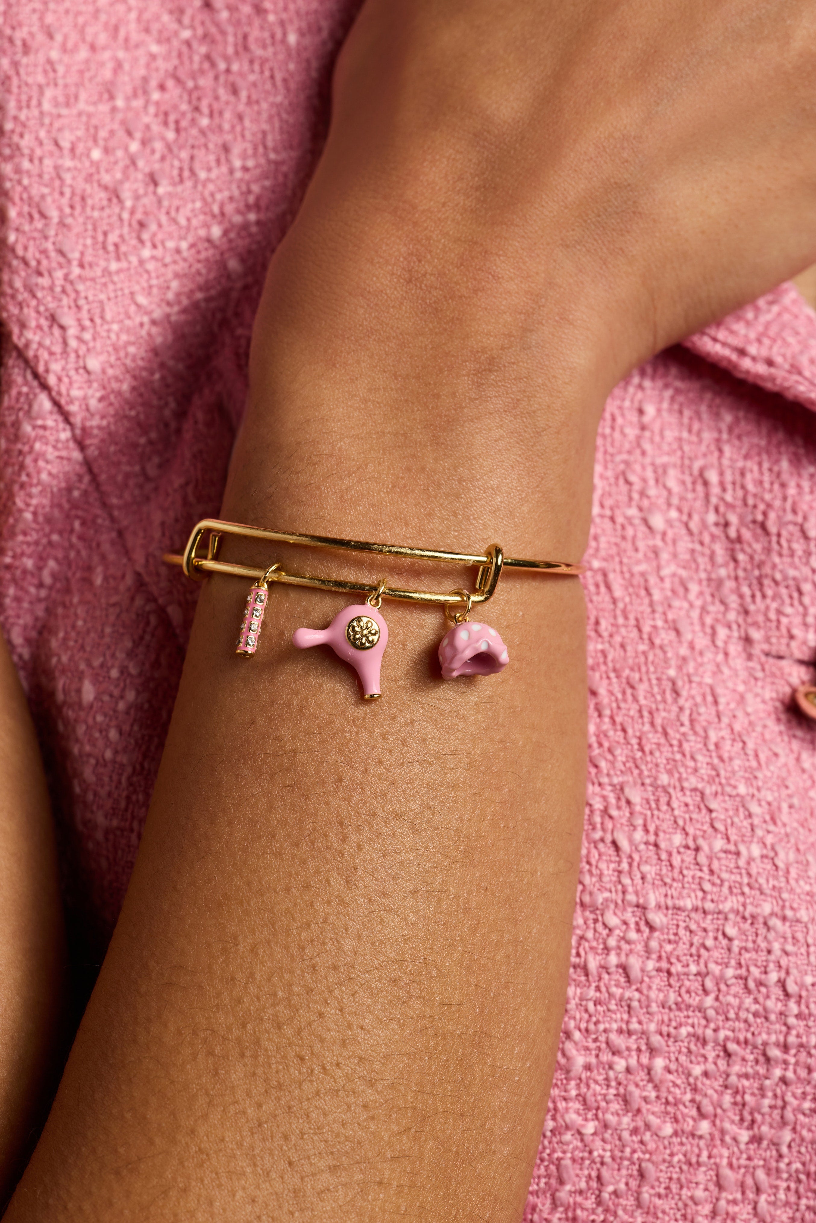 Step back in time with this retro-inspired bangle celebrating the iconic 1960s beauty era. Featuring charming miniature hair dryer, hair roller, and shower cap charms, it's a nostalgic nod to vintage portable hair dryer bags. Perfect for vintage lovers and anyone who appreciates mid-century style with a playful twist.