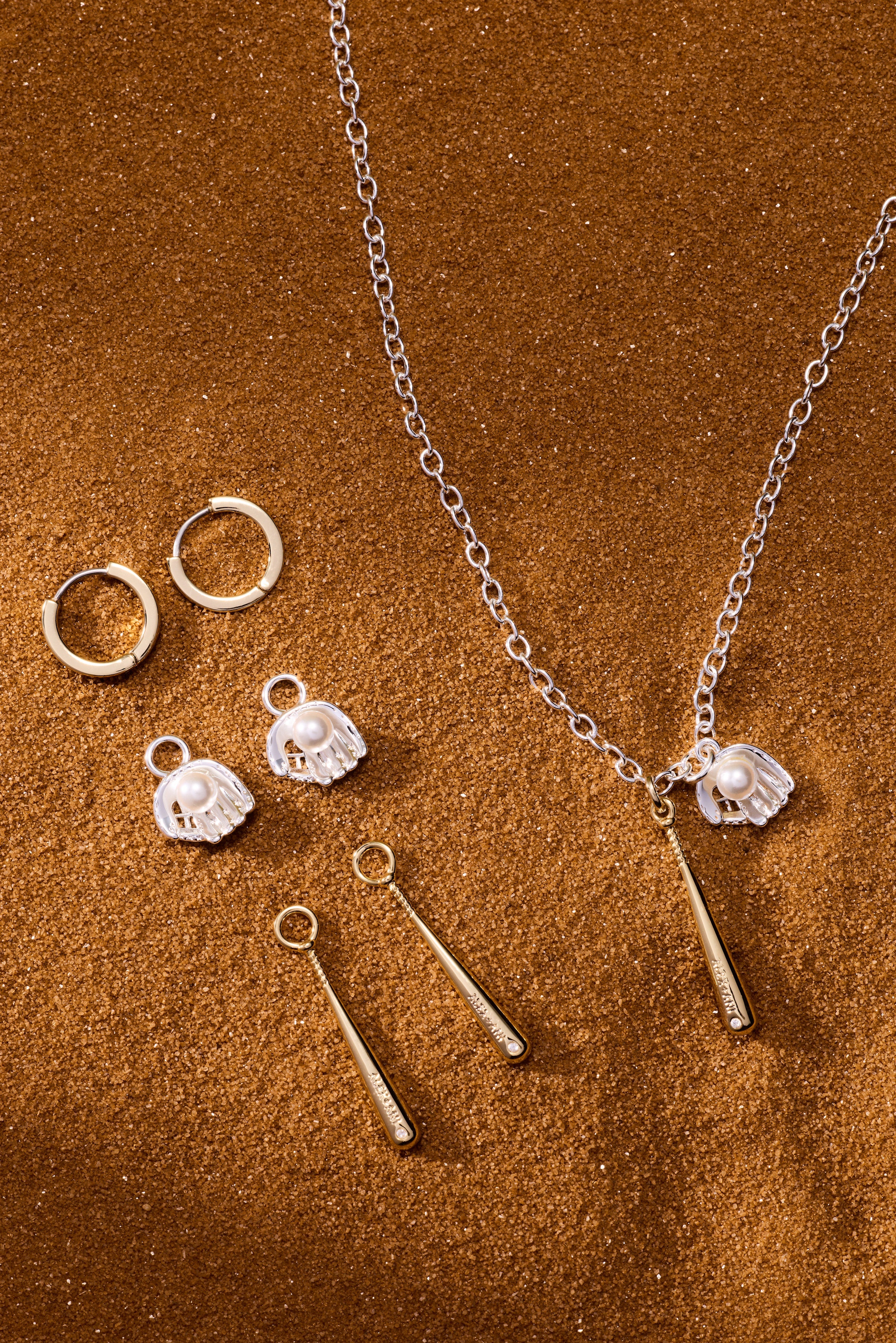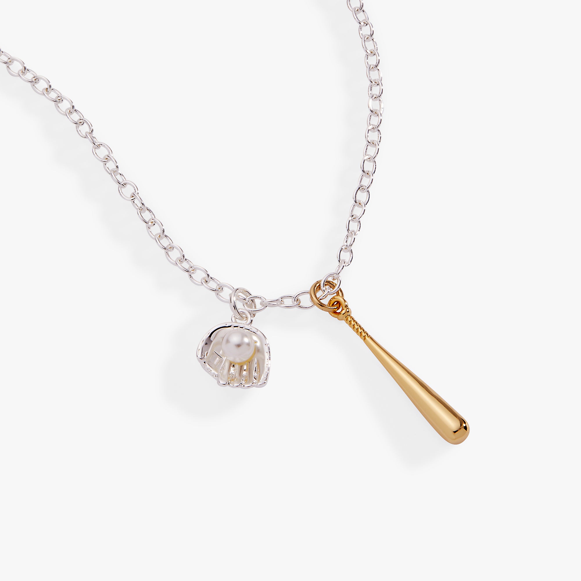 Celebrate the love of the game with this striking two-toned baseball bat and glove pendant. Featuring a gleaming gold baseball bat paired with a polished silver glove cradling a lustrous pearl "baseball," this charm pendant captures the spirit of the game in elegant detail. Perfect for baseball enthusiasts and sports lovers who want to wear their passion close to their heart.