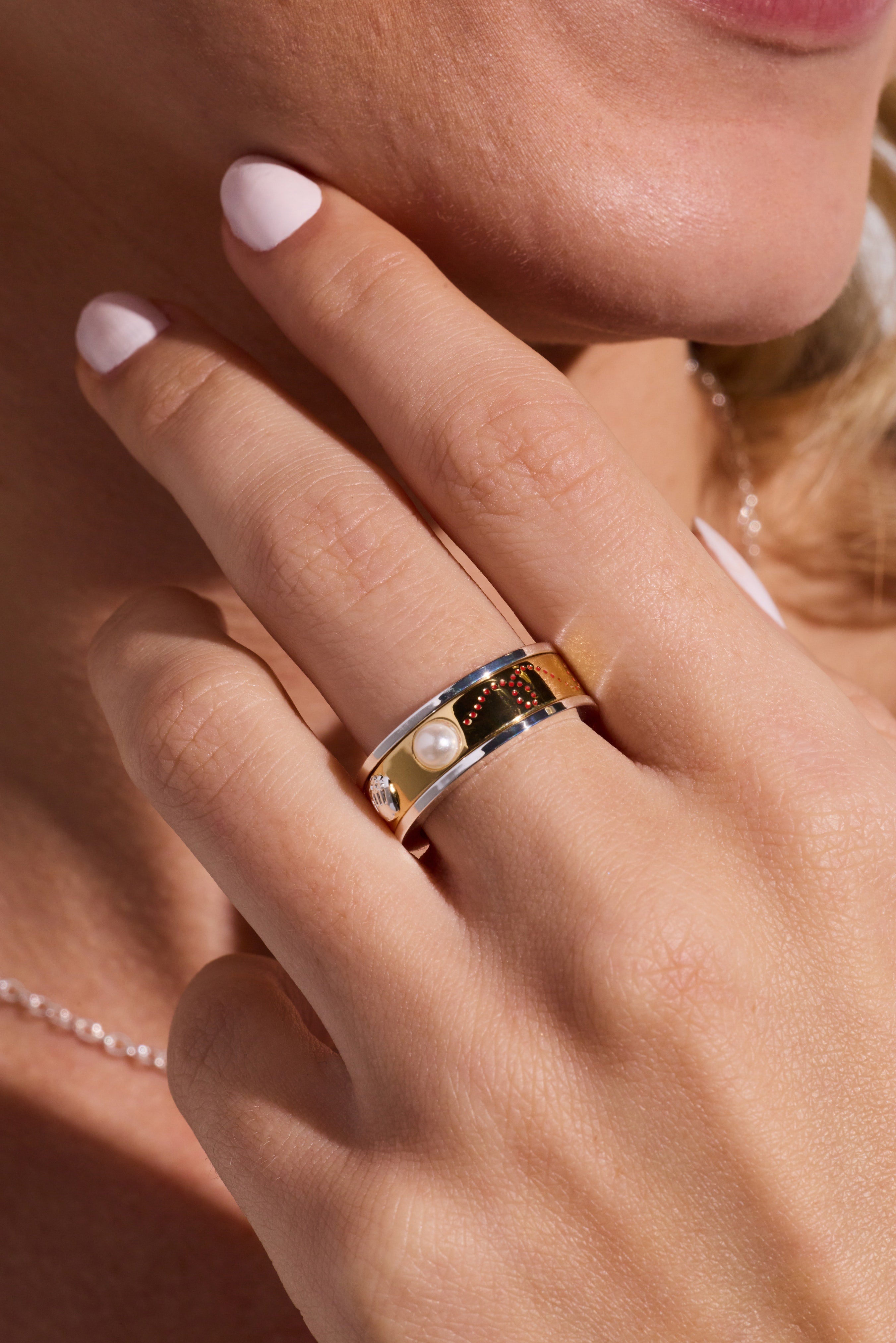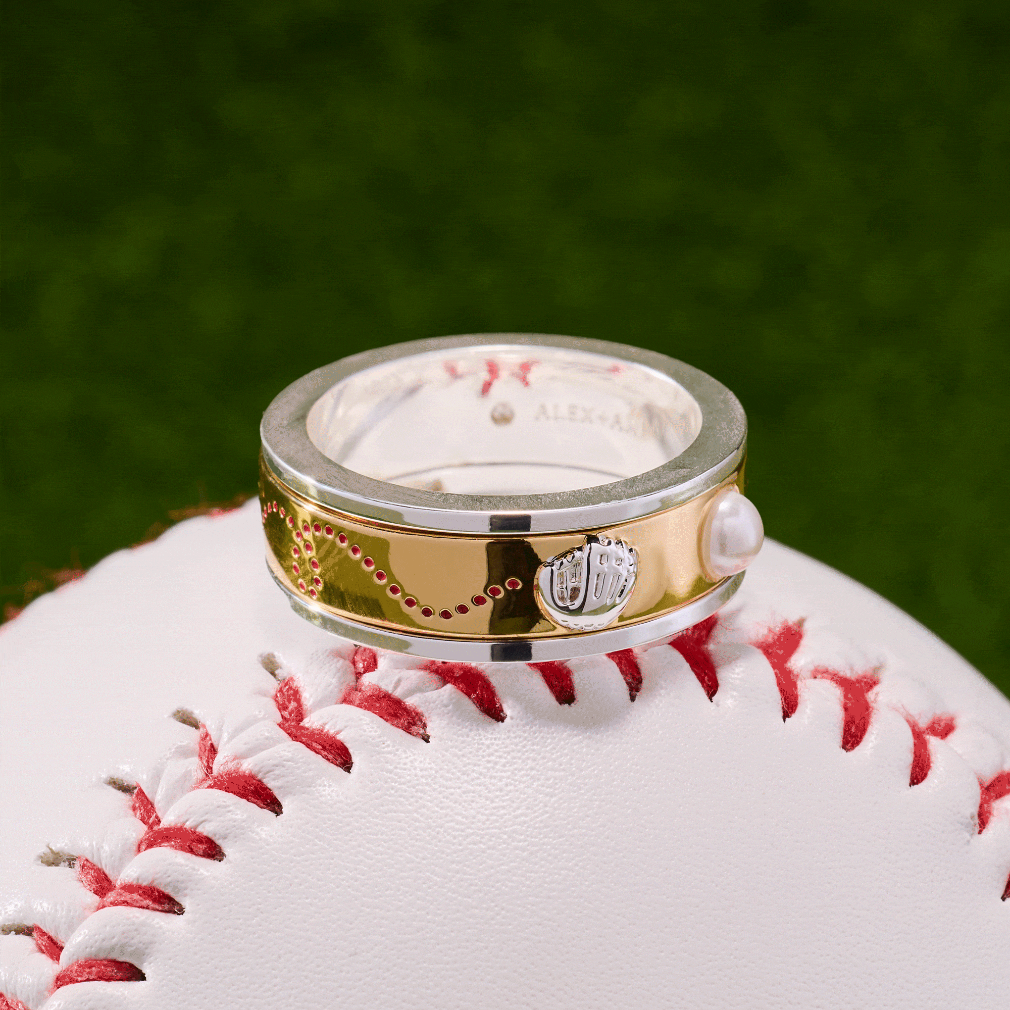 Keep your hands engaged with this playful Baseball Fidget Ring, featuring a spinning design that brings movement and style together. Crafted in two-toned gold and silver, it showcases a lustrous pearl "baseball" that rotates smoothly, complemented by a detailed silver glove and vibrant red enamel accents. Perfect for fidgeting, focusing, or simply enjoying a touch of sporty charm on your finger.
