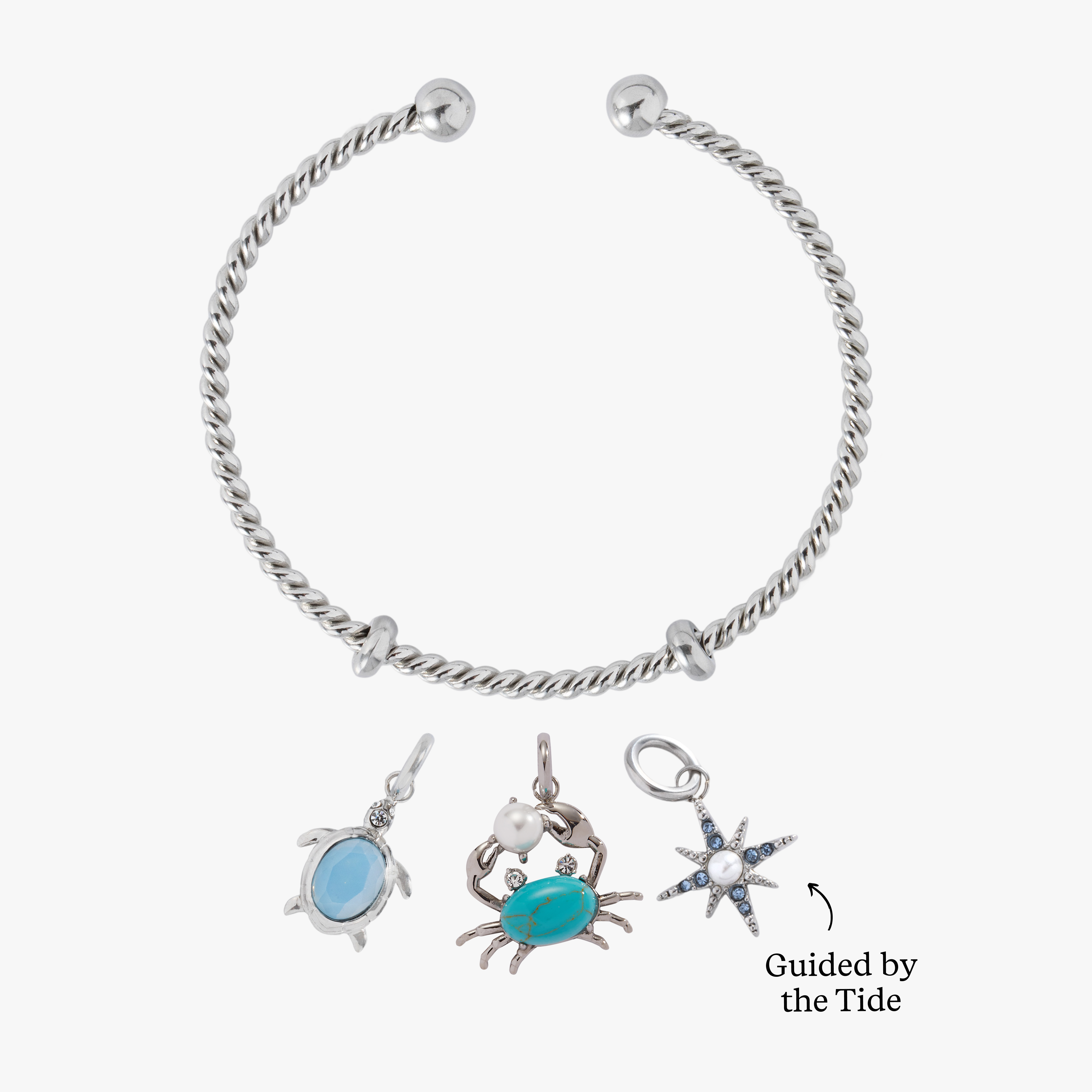 A little moody, a lot adorable. This bundle includes a turquoise-and-pearl crab charm, sparkling compass star, and shimmering blue crystal accent. Includes a free rope cuff base for easy stacking and gifting.