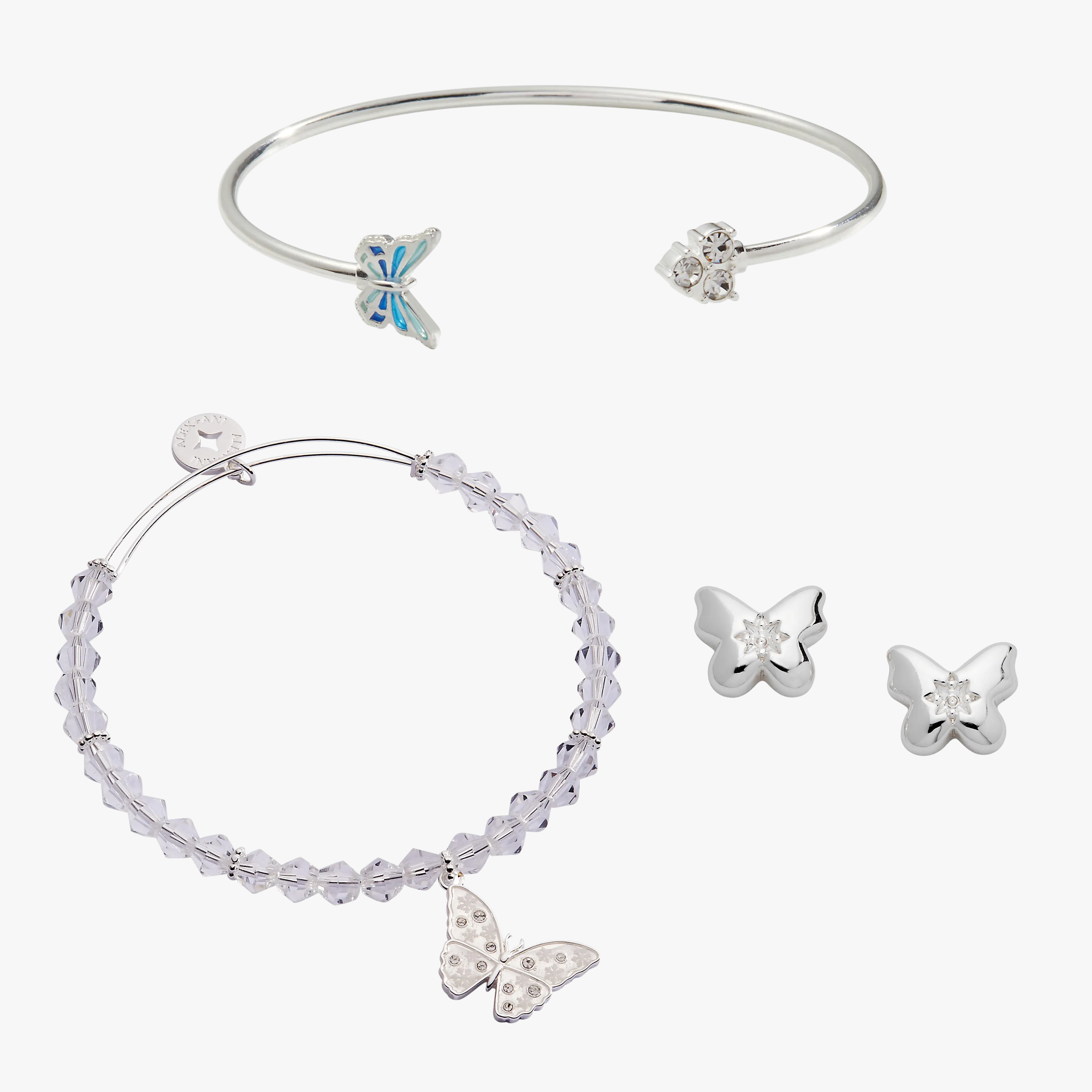 Spread your wings with our enchanting Crystal Flight Butterfly Bundle! This trio celebrates the magic of transformation with three stunning pieces: puffy butterfly crystal earrings that bring earthy elegance, a delicate glass butterfly beaded charm bangle for whimsical flair, and a butterfly-adorned crystal flex cuff that sparkles with every move. Mix, match, and layer these beauties to create your perfect look—whether you're channeling serene sophistication or playful charm. A fluttering collection that's as versatile as it is captivating.