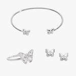 Spread your wings with our enchanting Crystal Flutter Butterfly Bundle! This whimsical collection features delicate puffy butterfly crystal studs that catch the light beautifully, a flexible cuff bracelet adorned with shimmering butterfly crystals for effortless elegance, and a stunning glass butterfly statement ring that commands attention. Perfect for butterfly lovers and crystal enthusiasts alike, this trio brings a touch of nature-inspired magic to any look. Mix, match, and let your style take flight!