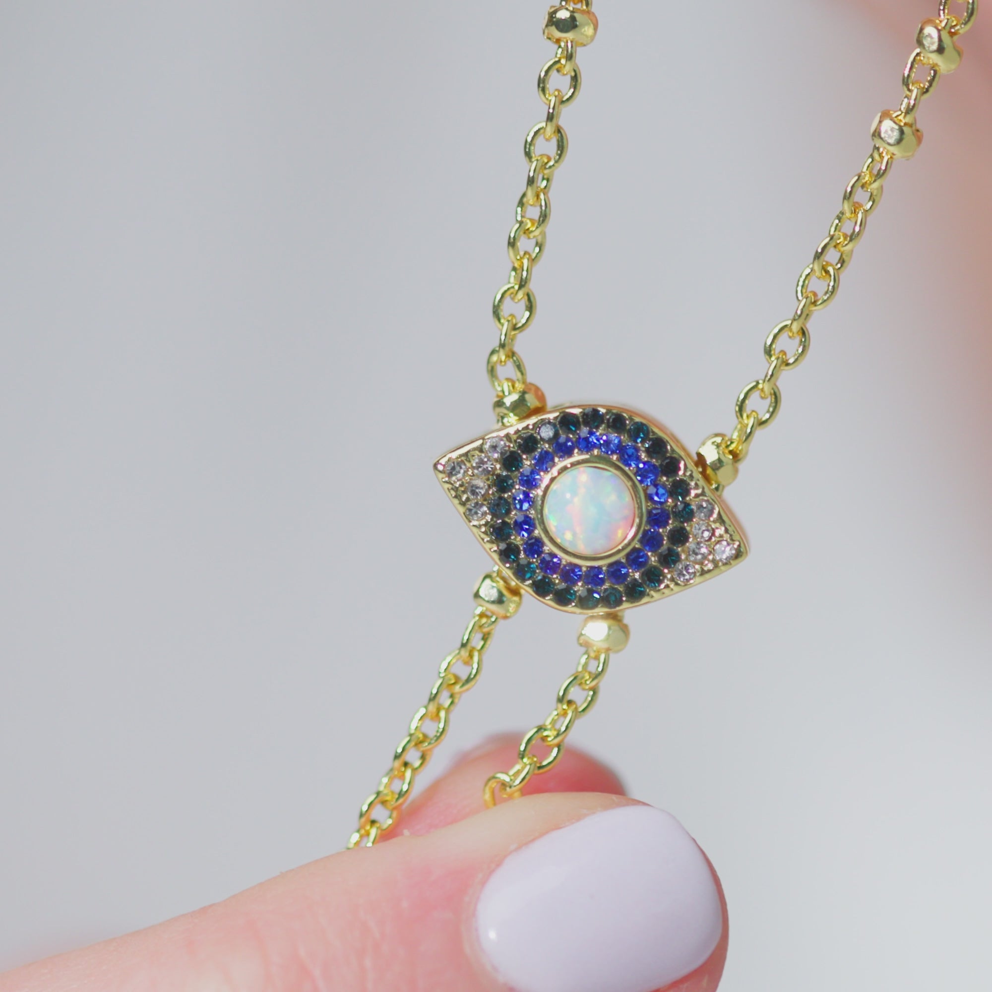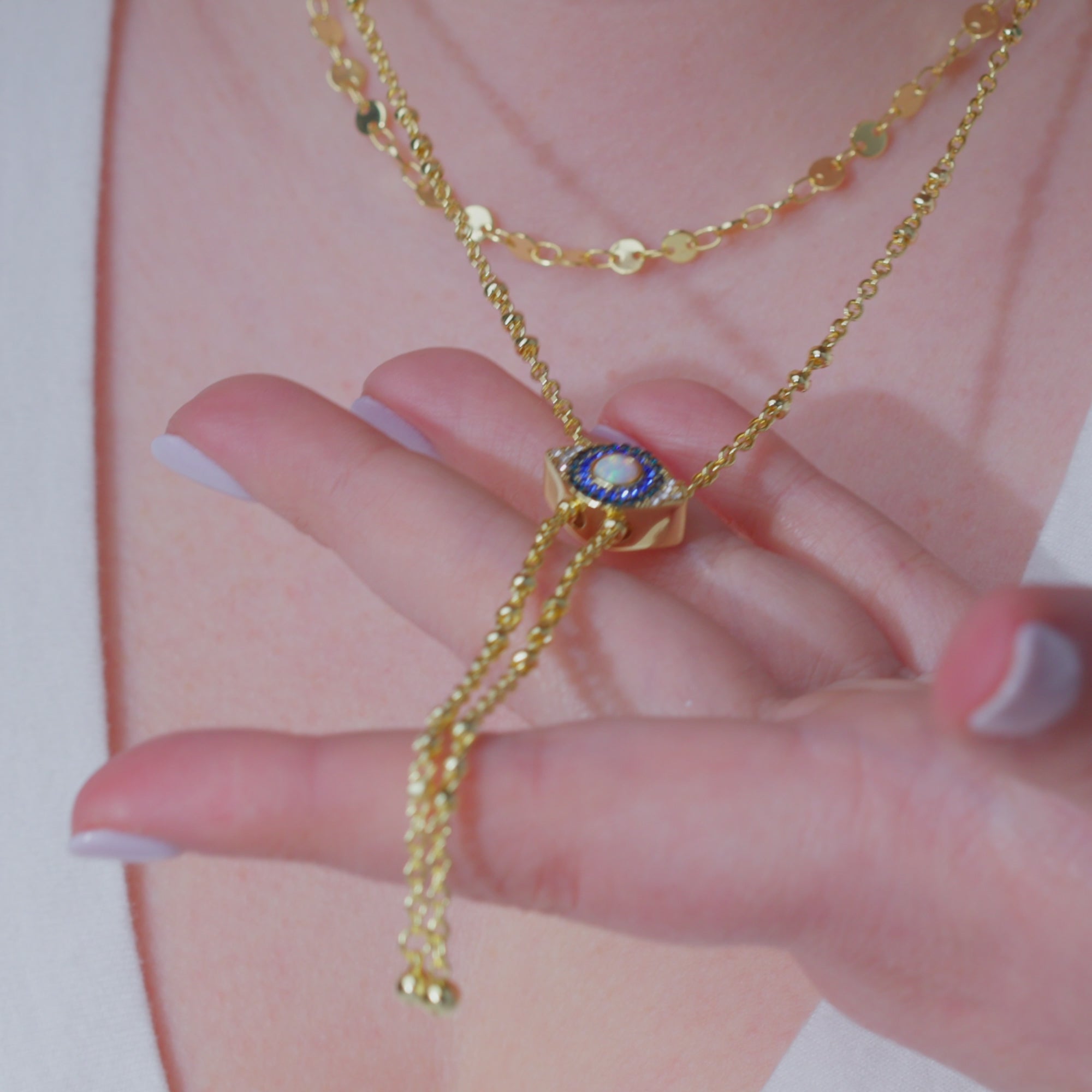 Look stylish and express your individuality with this Evil Eye Layered Bolo Necklace. Its layered chain and adjustable clasp create a unique bolo design with a hanging chain for an eye-catching detail. The crystal-infused evil eye charm is an enigmatic finishing touch with its opal stone center.