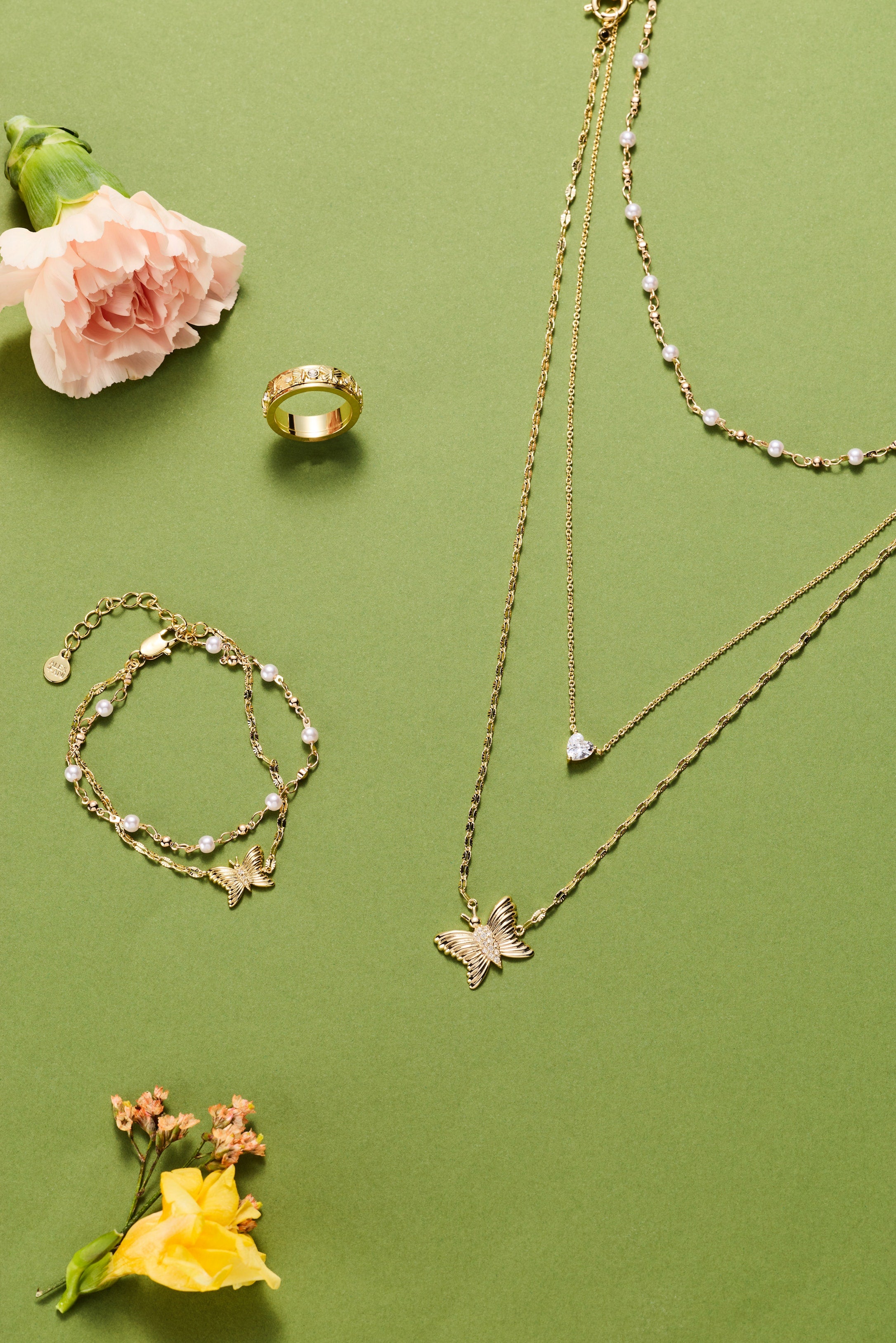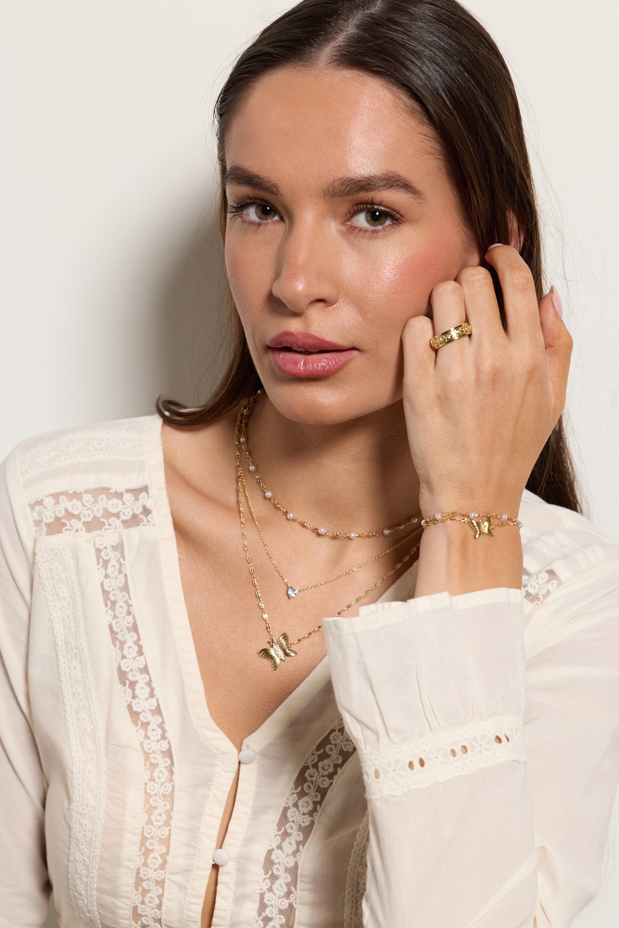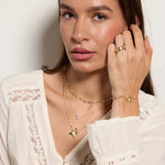 Effortless layered elegance meets festival vibes. This three-strand necklace features shiny gold with clear crystal pavé and white pearls—no styling guesswork required. The shortest strand showcases rosary-linked pearl beads, the middle strand pairs a delicate cable chain with a bezel-set crystal heart pendant, and the longest strand features a faceted lip chain topped with a fluted butterfly adorned with pavé detailing. Pre-layered for instant boho-chic impact.