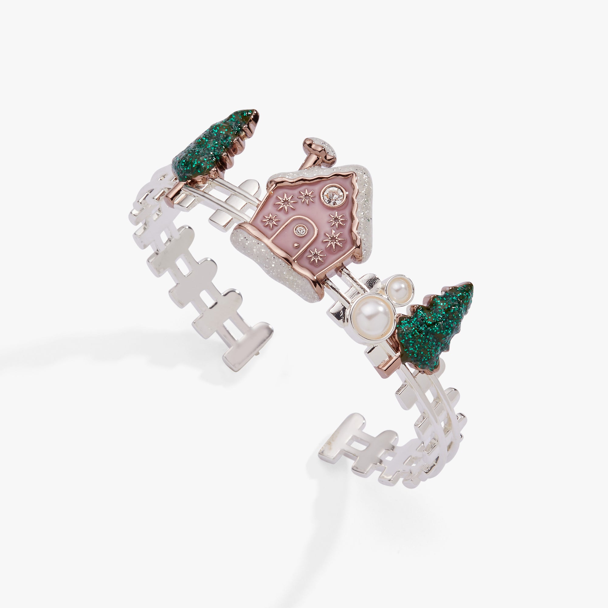 Celebrate the magic of the holiday season with this playful Gingerbread House Cuff. It showcases a whimsical picket fence design that wraps around your wrist, highlighting a sweet enamel gingerbread house sparkling with stone accents. Enamel pine trees add a splash of evergreen charm, while a pearl snowman brings a touch of frosty fun. Perfect for adding a festive and merry touch to any outfit, this cuff captures the cozy spirit of winter in a fun, wearable form.