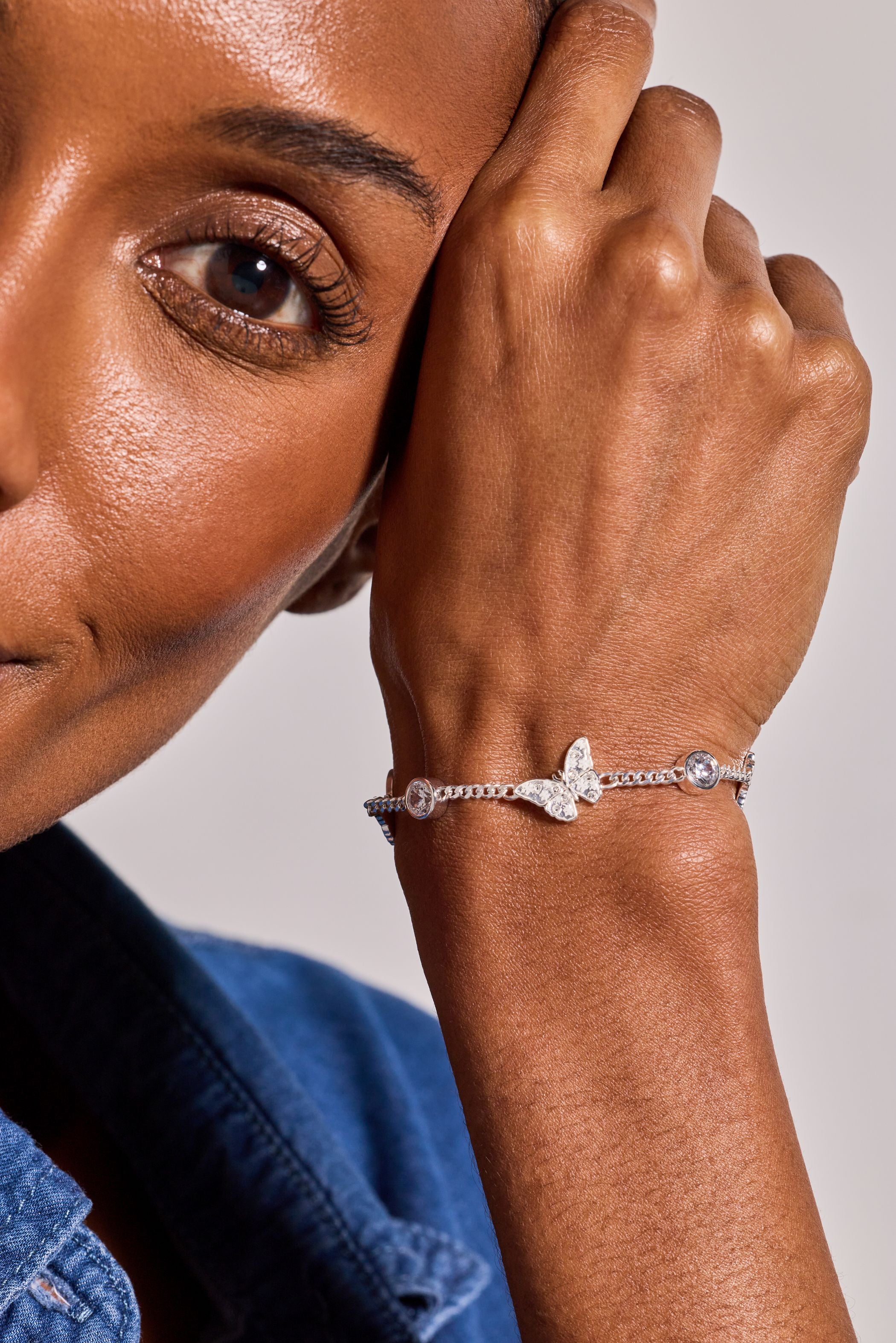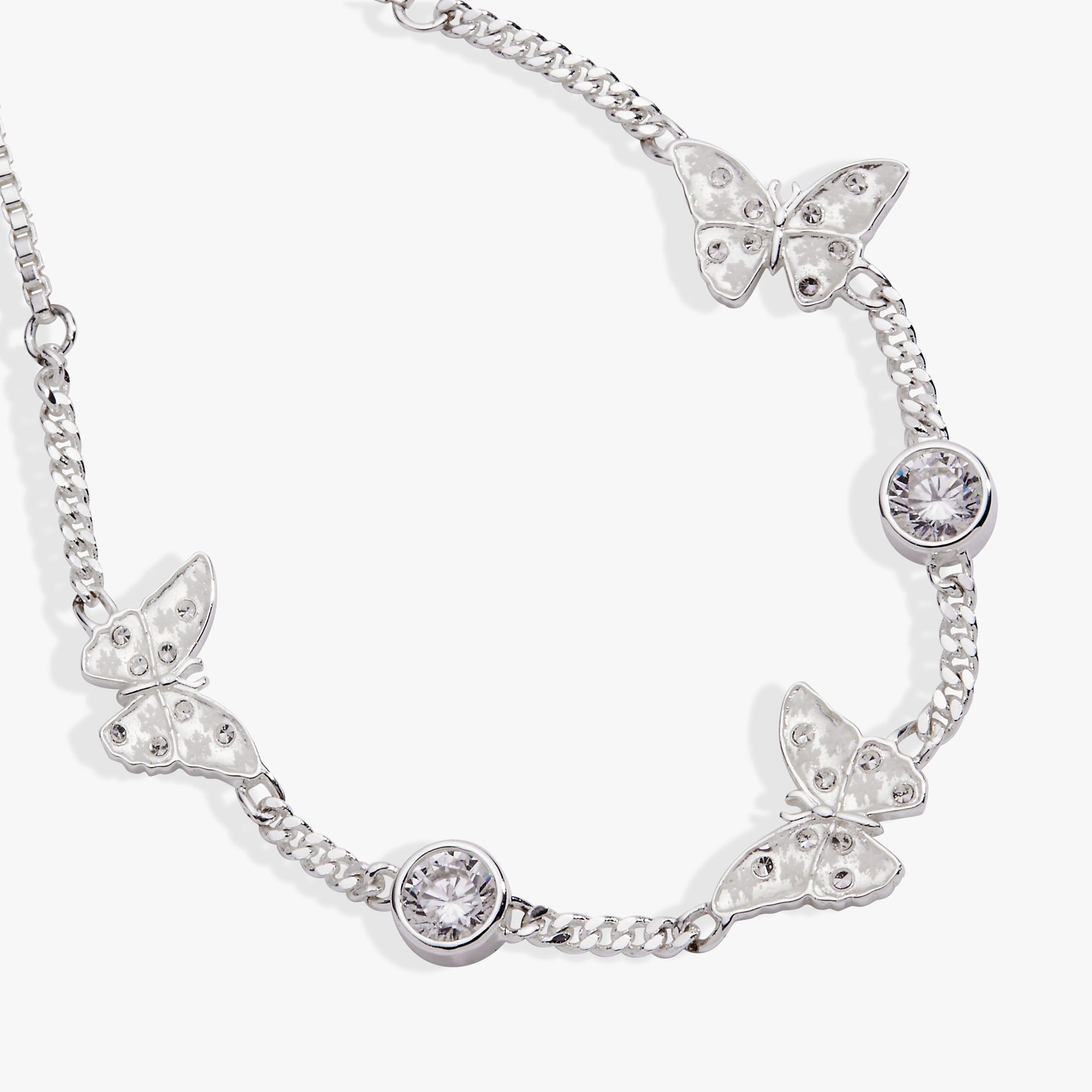 Delicate butterflies take flight around your wrist in this whimsical bolo bracelet, complete with shimmering clear stone accents and intricate snowflake etchings adorning each wing. The charming inline design features butterflies with crisp enamel details that catch the light beautifully, making this piece a playful celebration of nature's most graceful creatures.