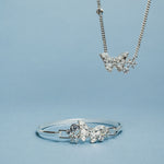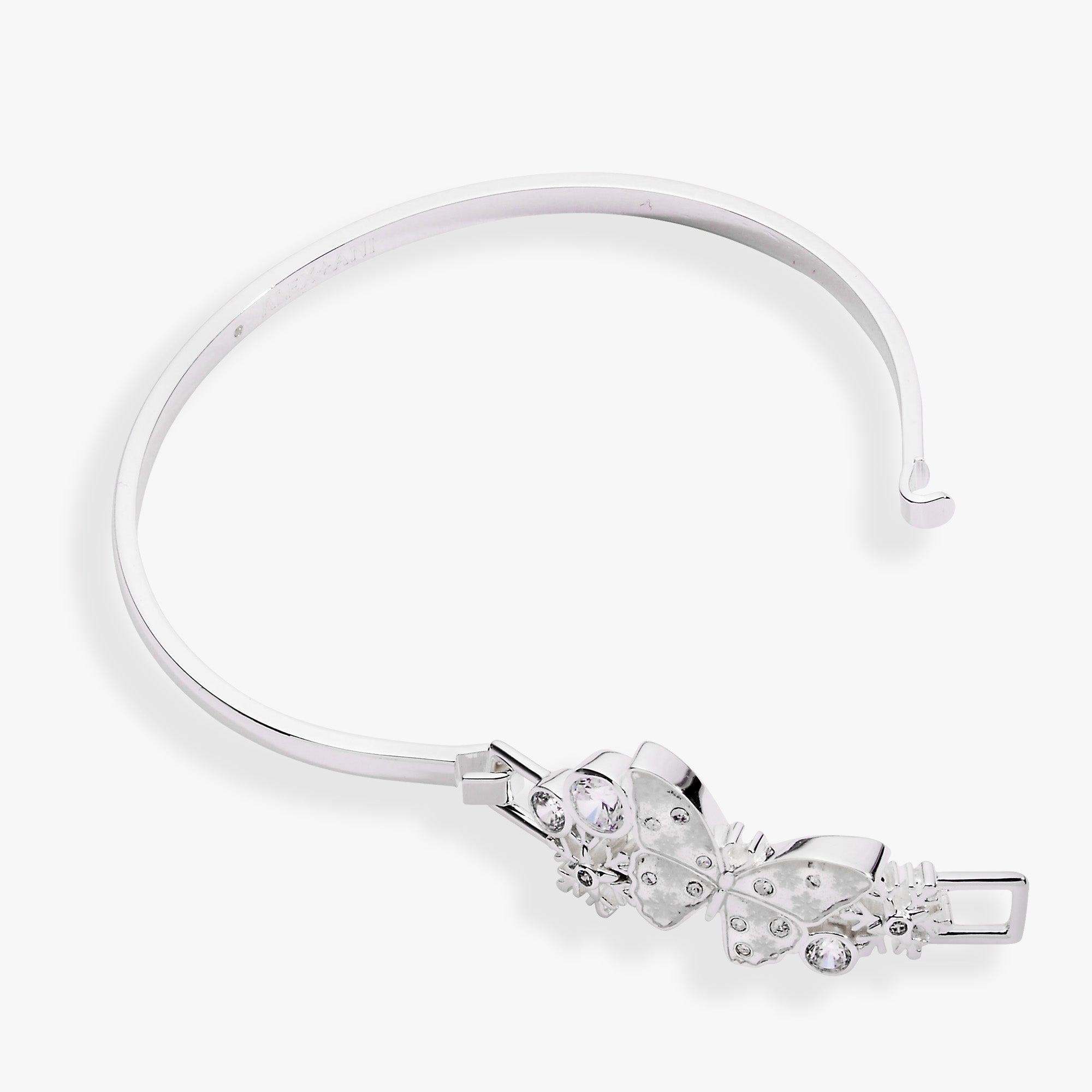 This whimsical tension bangle features a delicate butterfly suspended in the center, adorned with sparkling clear enamel and shimmering stone accents. Intricate etched snowflakes dance across the butterfly's wings, while charming snowflake details and a signature logo star complete this enchanting design. A playful twist on classic elegance.