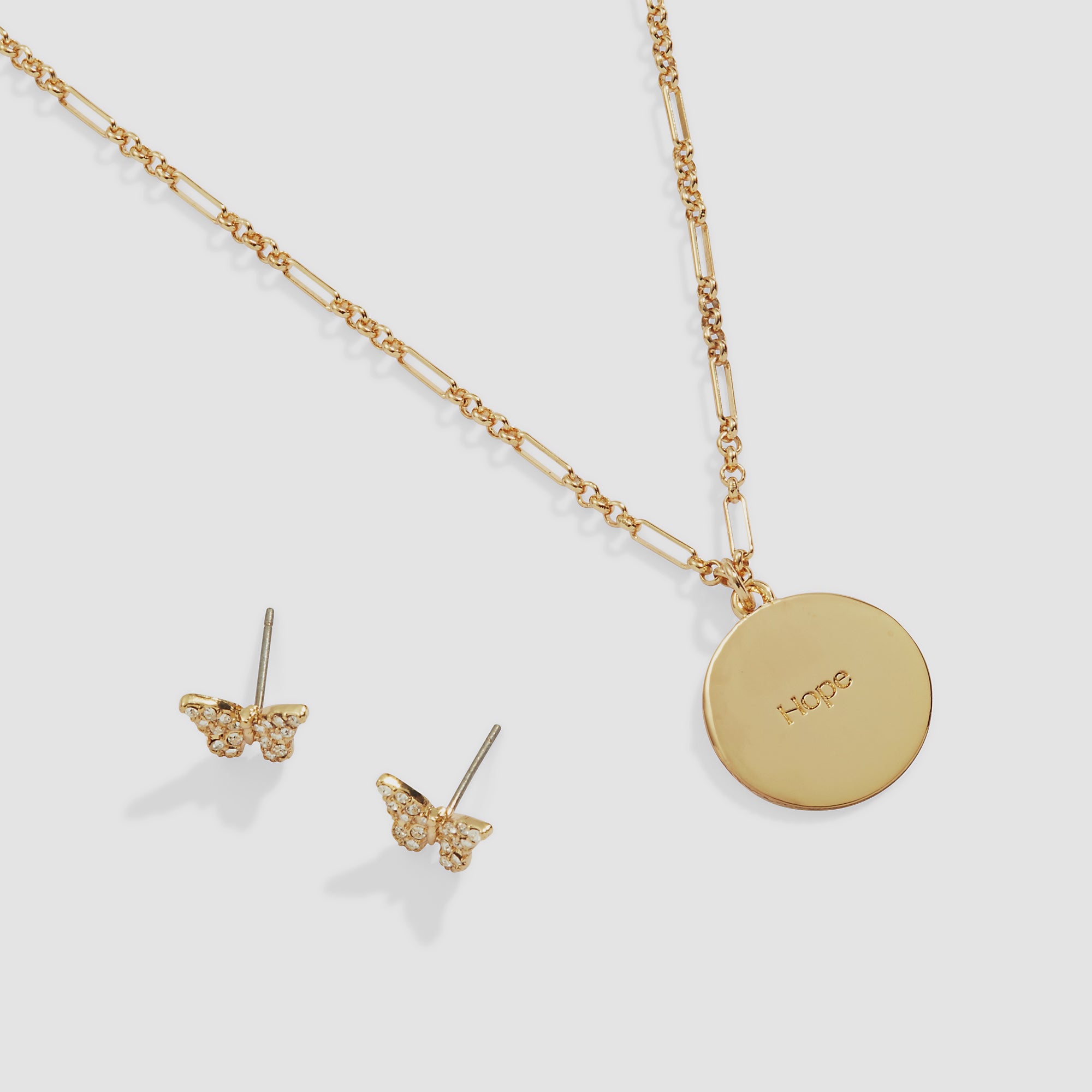 The butterfly teaches that there is hope in times of change; that for every ending, there is a new beginning; and that to blossom, you must first experience transformation. This Hope Charm Necklace and Stud Earring Gift Set features an embellished charm with a glass crystal stone butterfly on an intricate 16”-18” chain, and a set of matching glass crystal stone butterfly stud earrings. Embrace change and trust the process. Your new wings are on the other side.