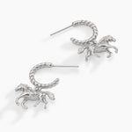 Celebrate your equestrian spirit with these charming huggie hoop earrings featuring a dimensional horse design adorned with brilliant faceted crystals. The rope-textured hoops frame the three-dimensional horse beautifully, catching light with every movement and adding a touch of sparkle to your everyday look. Perfect for Year of the Horse celebrations or simply showcasing your passion for these majestic creatures, these playful earrings bring personality and whimsy to any outfit. The intricate crystal embellishments and dimensional detailing create a conversation-starting accessory that's both enchanting and eye-catching. An ideal piece for equestrian enthusiasts seeking a delightful statement that's as spirited as you are.