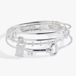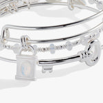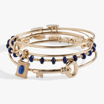 Craft a perfectly curated look with the Lock and Key Set of 3 Bangles. These timeless symbols represent security, trust and the unique bond shared between you and someone you love. Wear a personal reminder that your heart's secrets are safe and cherished. This set is accented with blue lapiz gemstones or luminous moonstone.
