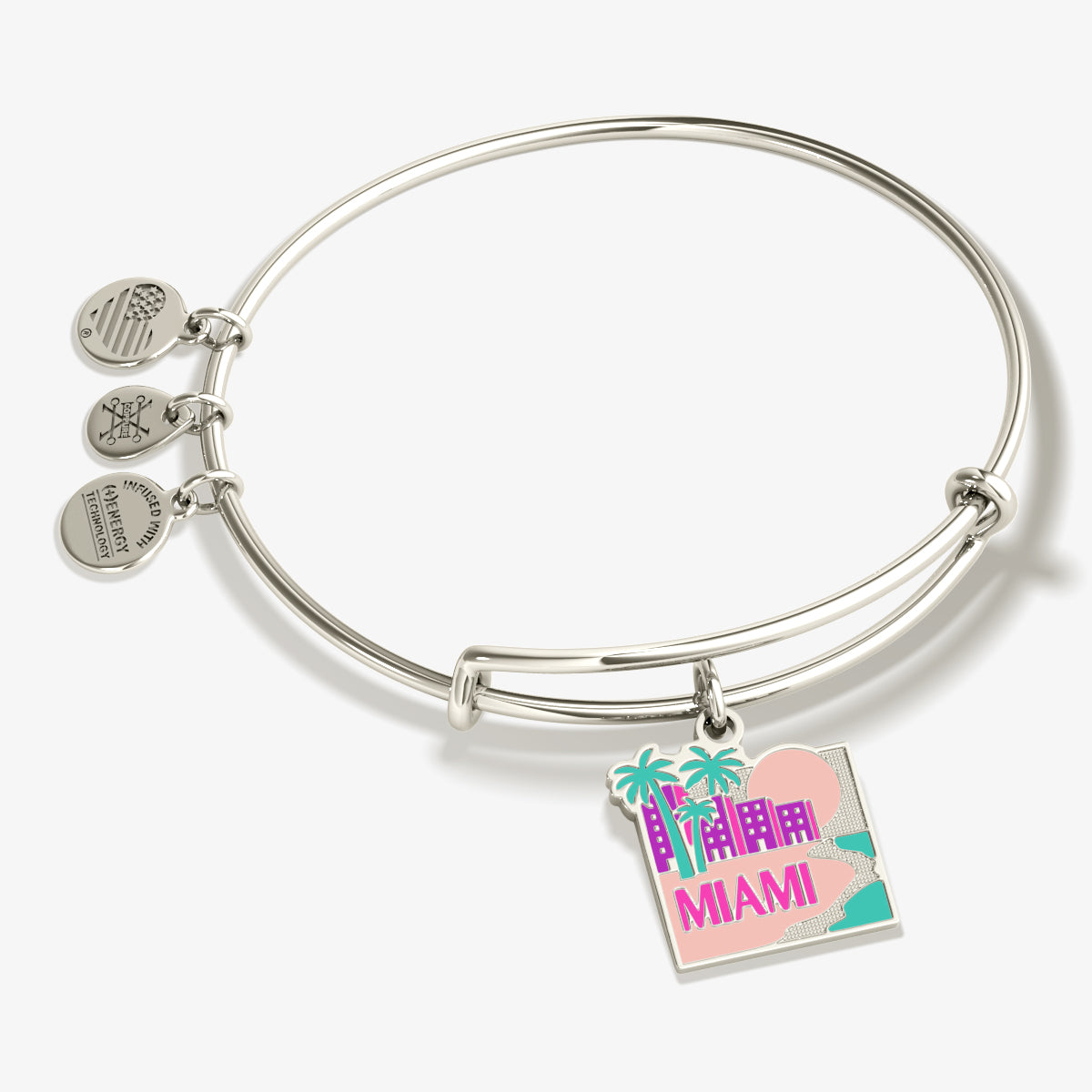 The heat in Miami doesn't just come from the sun. Capture the essence of this vibrant city with the Miami Expandable Wire Bangle. This souvenir bracelet features the iconic Art Deco architecture of Ocean Drive, with vivid pink and blue accents that sizzle like South Beach itself.