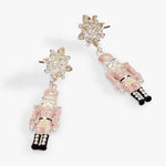 Add a touch of festive whimsy to your look with these Nutcracker Drop Earrings. Each earring features a sparkling crystal snowflake stud paired with a charming nutcracker drop adorned with glitter enamel, pearl accents, and shimmering crystals. Perfect for holiday celebrations or brightening up any day with playful sparkle.
