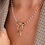 Embrace timeless elegance with this refined pearl necklace, featuring lustrous white pearl beads strung on a delicate rosary chain. A gold-plated dimensional bow adorned with a sparkling clear crystal princess cut stone serves as the striking centerpiece. The intricate craftsmanship delivers an understated luxury that transcends occasion—equally at home layered with everyday pieces or paired with evening wear. A contemporary take on classic femininity, this versatile design bridges modern sensibility with enduring sophistication.