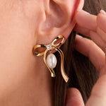 Make a statement with these charming drop earrings that blend timeless elegance with contemporary flair. Featuring a gold-plated bow adorned with a sparkling crystal center and a lustrous pearl drop, they're crafted with meticulous detail that rivals fine jewelry. Perfect for channeling the coquette aesthetic while embracing the pearl trend, these versatile beauties transition effortlessly from casual to dressed-up occasions. Whether you're leaning into feminine charm or modern sophistication, these earrings deliver the perfect finishing touch.