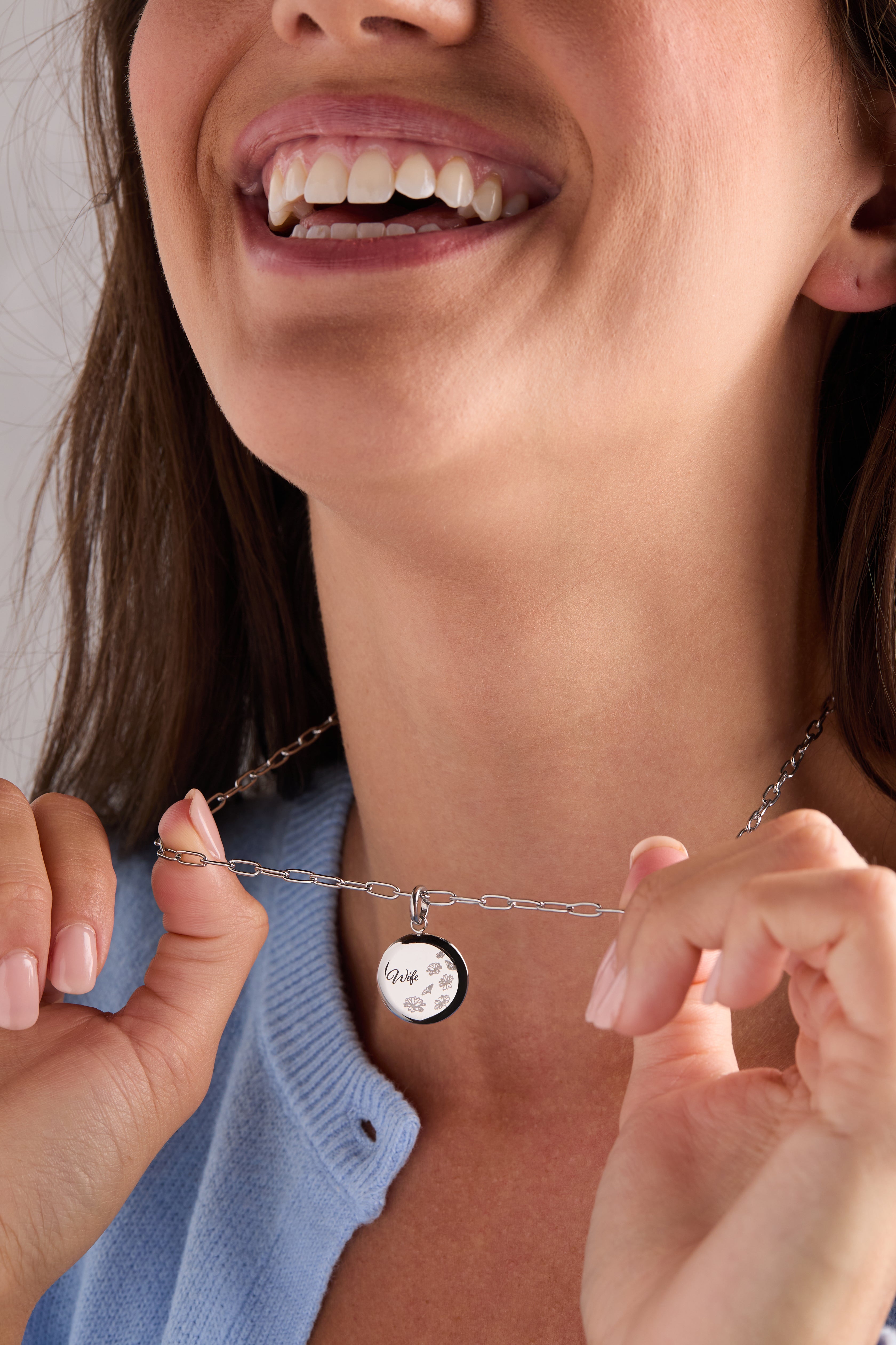 Celebrate the bond you share with this enchanting Wife charm, adorned with delicate flower etchings that catch the light beautifully. Flip it over to discover an inspiring message: "Side by side or miles apart, family will always be connected by heart." A meaningful reminder that love transcends distance, this interchangeable charm transforms your bracelet or necklace into a personal keepsake that honors the special woman in your life.